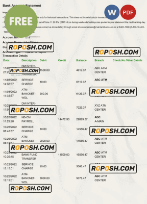 Grab now fully editable bank account statement sample in Word Template from our website Roposh and put your own info to create Realistic Bank Statement Word template and ready your own novelty documents. It’ll be so beneficial if your Bank Statement is expired, stolen or not available.We also have editable credit card, ID Card psd template, Bank Statement psd template, drivers license psd template & printable editable blank utility bill template.