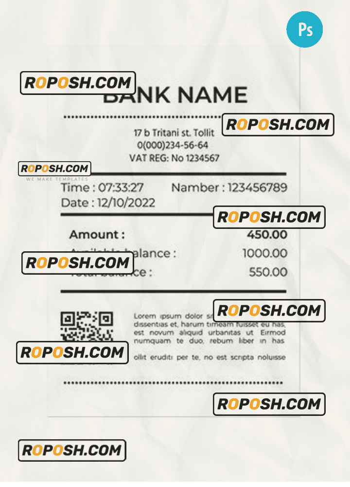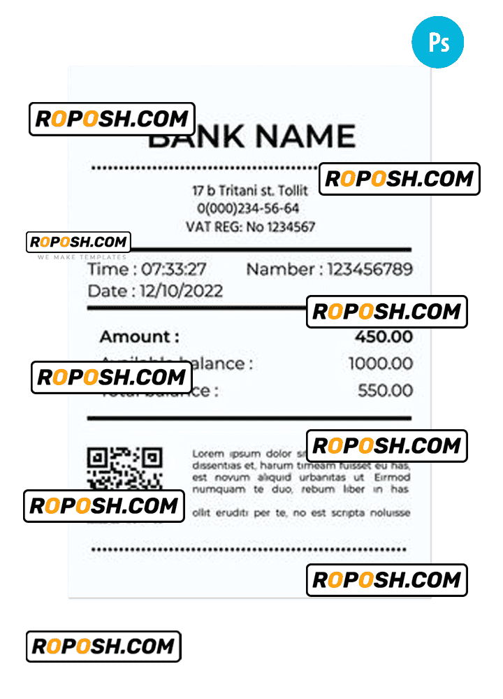 A collection of BANK payment receipt samples can act as proof that a transaction has been successfully completed; for your convenience, editable payments templates options come in various formats, including Word, Excel, PDF, PSD, Docs and Google Sheets. We provide store receipts’ templates for different types of usages, such as sales, rent, pharmacy, food, and donation receipts from renown markets, services, and shops. Our goal is to offer you reliable and professional design pay editable options that help you manage your finances gals.