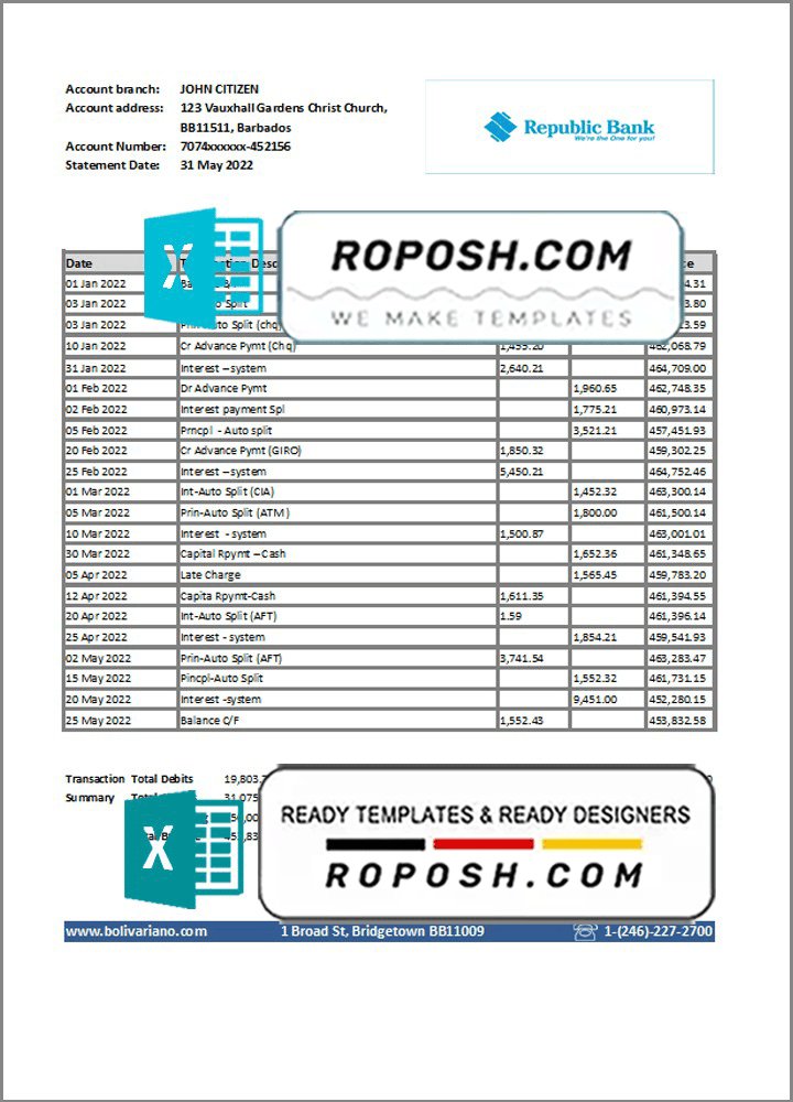 Barbados Republic Bank Statement Template in Excel and PDF Format