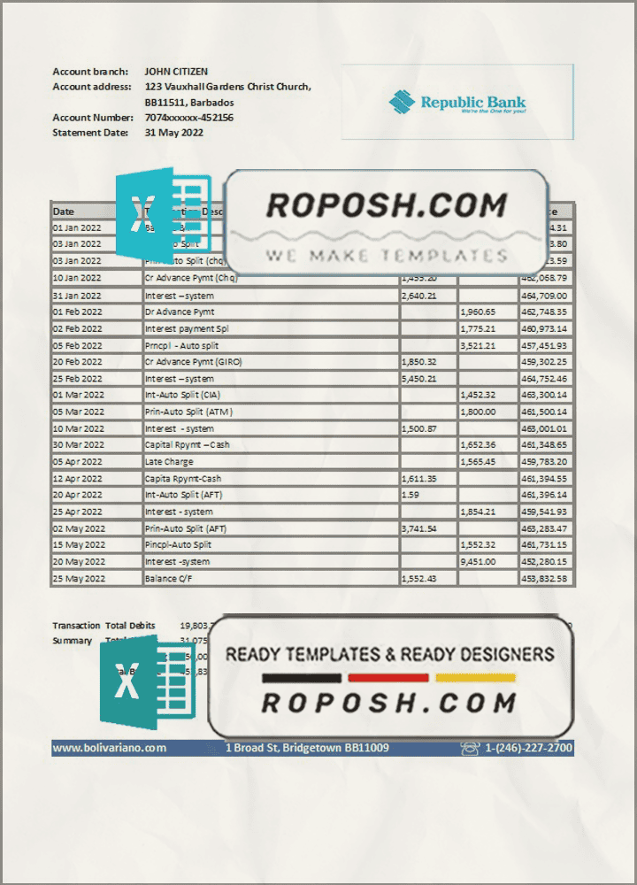 Get your fully editable Barbados Republic Bank Statement Excel Template from Roposh and personalize it to create your own novelty documents. This template is beneficial if your bank statement is expired, stolen, or unavailable. We also offer editable credit card templates, ID card templates, bank statement PSD templates, driver’s license PSD templates, and printable editable blank utility bill templates.