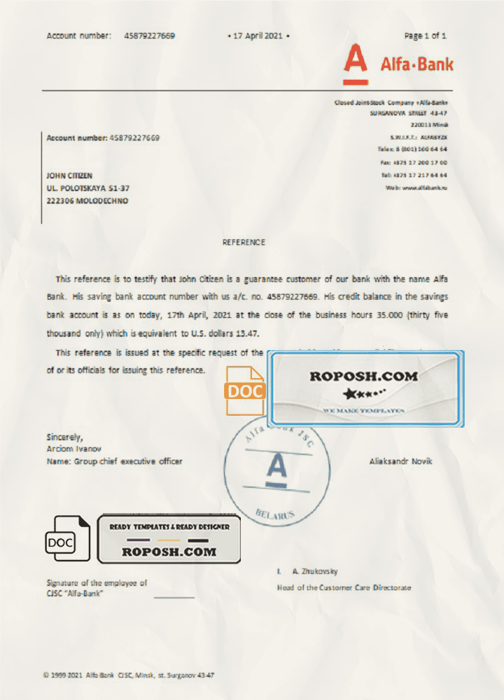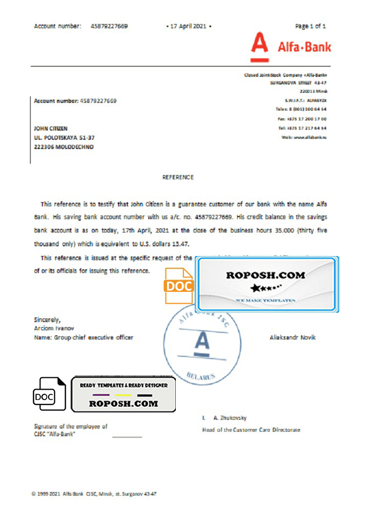 Belarus Alfa bank reference letter template in Word and PDF format