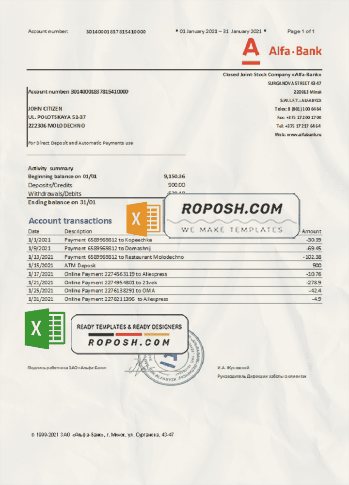 Grab now fully editable Belarus Alfa bank statement Excel Template from our website Roposh and put your own info to create Realistic Bank Statement template Excel and ready your own novelty documents. It’ll be so beneficial if your Bank Statement is expired, stolen or not available.We also have editable credit card, ID Card psd template, Bank Statement psd template, drivers license psd template & printable editable blank utility bill template.