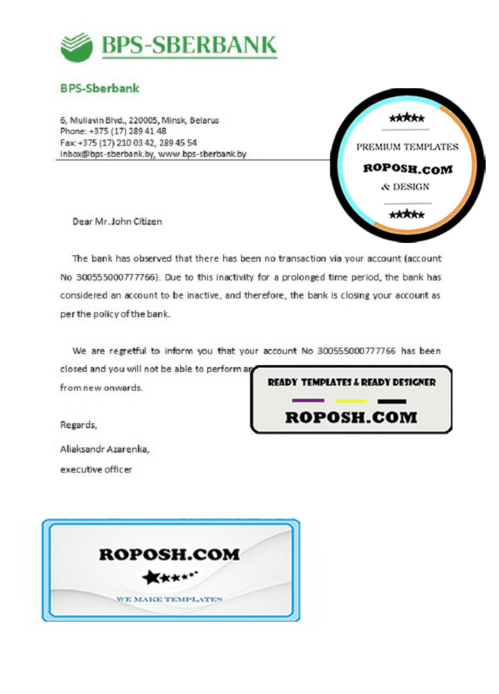 Belarus BPS-SBERBANK bank account closure reference letter template in Word and PDF format