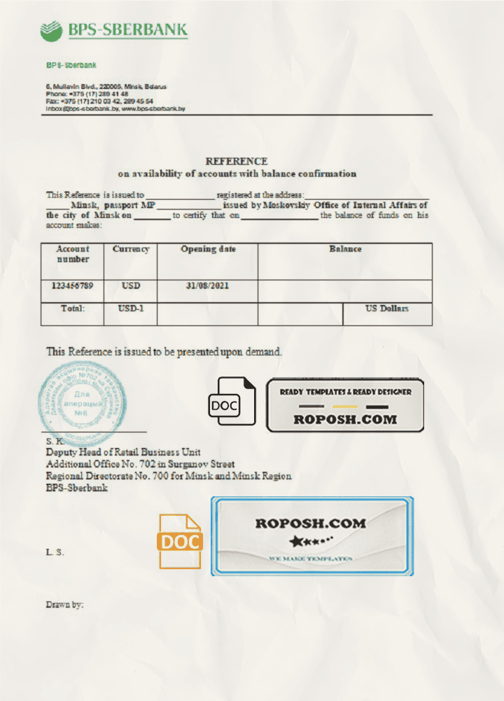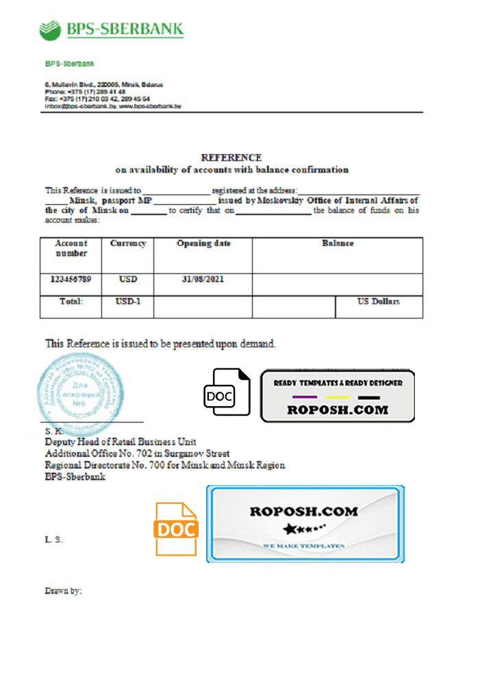 Belarus BPS-SBERBANK reference letter template in Word and PDF format