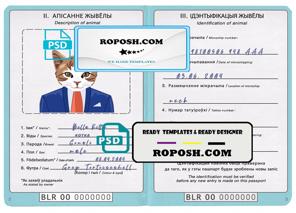 Belarus cat (animal, pet) passport PSD template, is designed to look and feel like real documents. Each template is carefully crafted to include all the necessary details, such as your pet’s name, breed, date of birth, and microchip information. With our fillable cat or dog passport templates, you can quickly and easily create a editable pet passport that meets all the requirements for international travel.