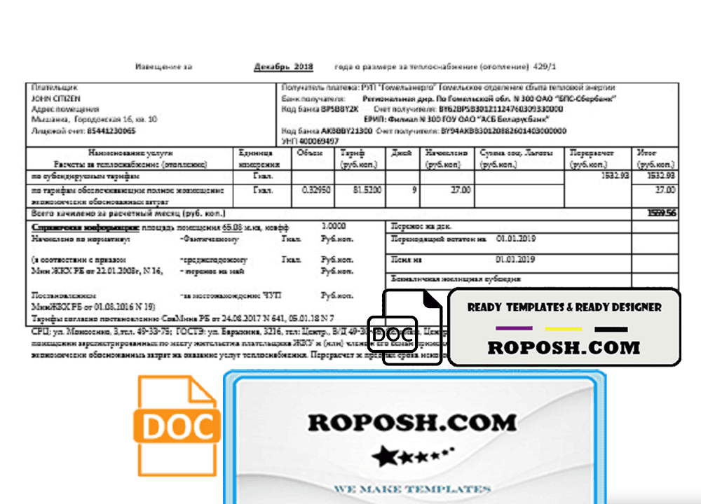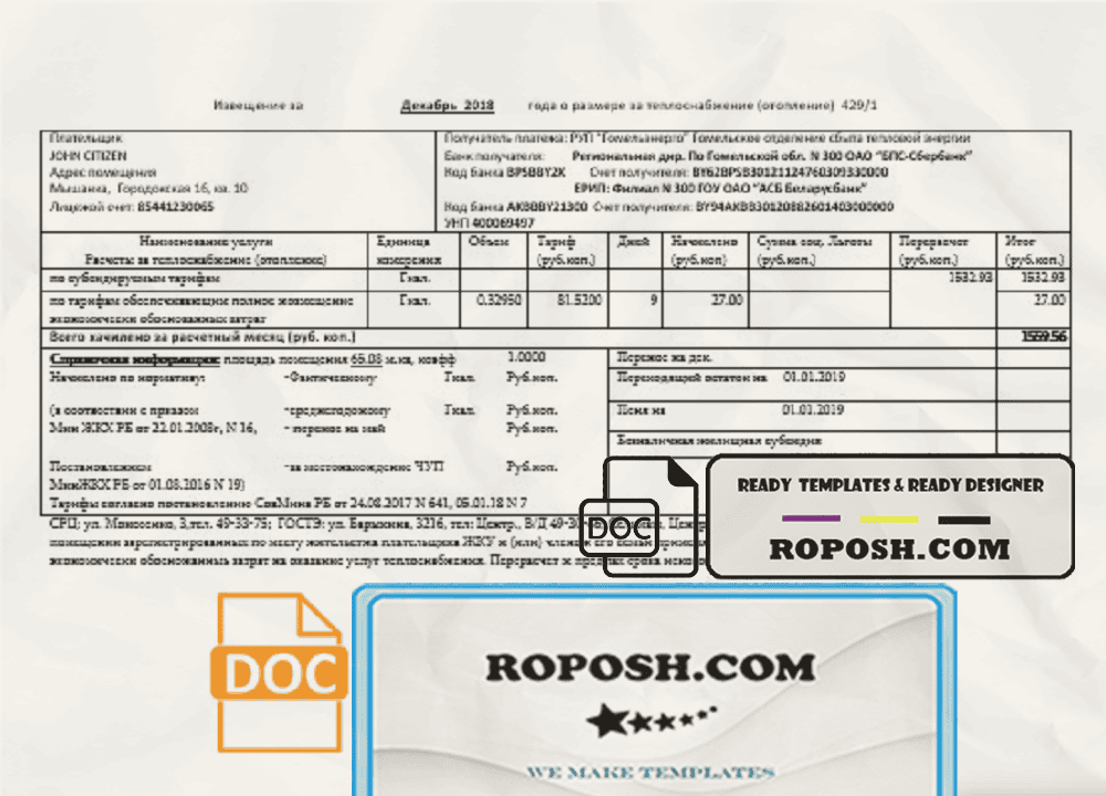 Get your blank Belarus Gomel Energo utility bill template from Roposh today. Customize it with your information to create a convincing proof of address document. This template is especially useful if your original utility bill is expired, lost, or unavailable. We also offer a wide range of templates, including passport PSD templates, ID card PSD templates, bank statement PSD templates, driver’s license PSD templates, and utility bill PSD templates.