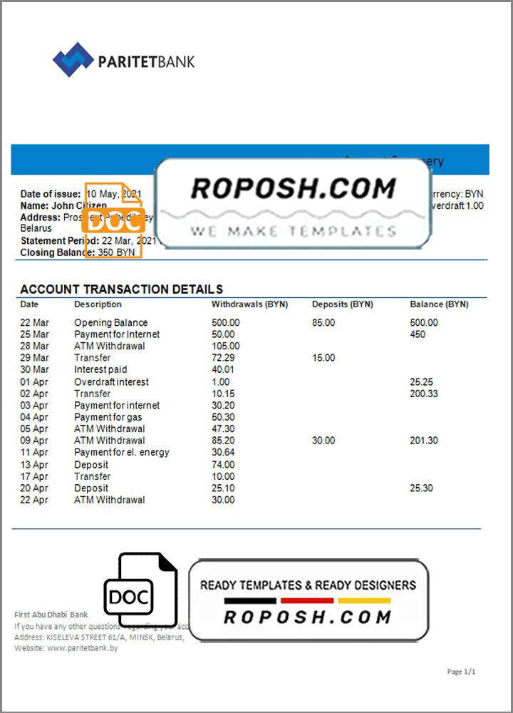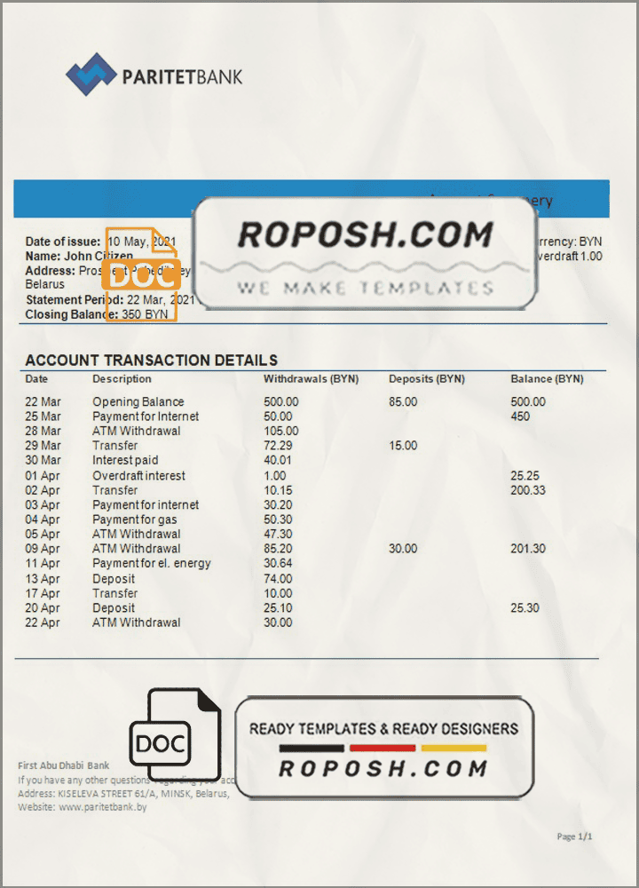 Get your fully editable Belarus Paritet Bank Statement Word Template from Roposh today. Customize it with your information to create realistic bank statements for educational or theatrical use. We also offer editable credit card templates, ID card templates, bank statement PSD templates, driver’s license PSD templates, and printable editable blank utility bill templates.