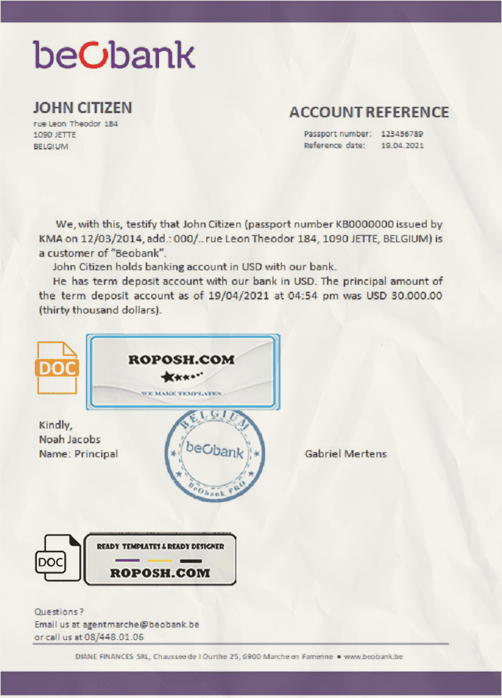 Be the first to review “Belgium Beobank account reference letter template in Word and PDF format”