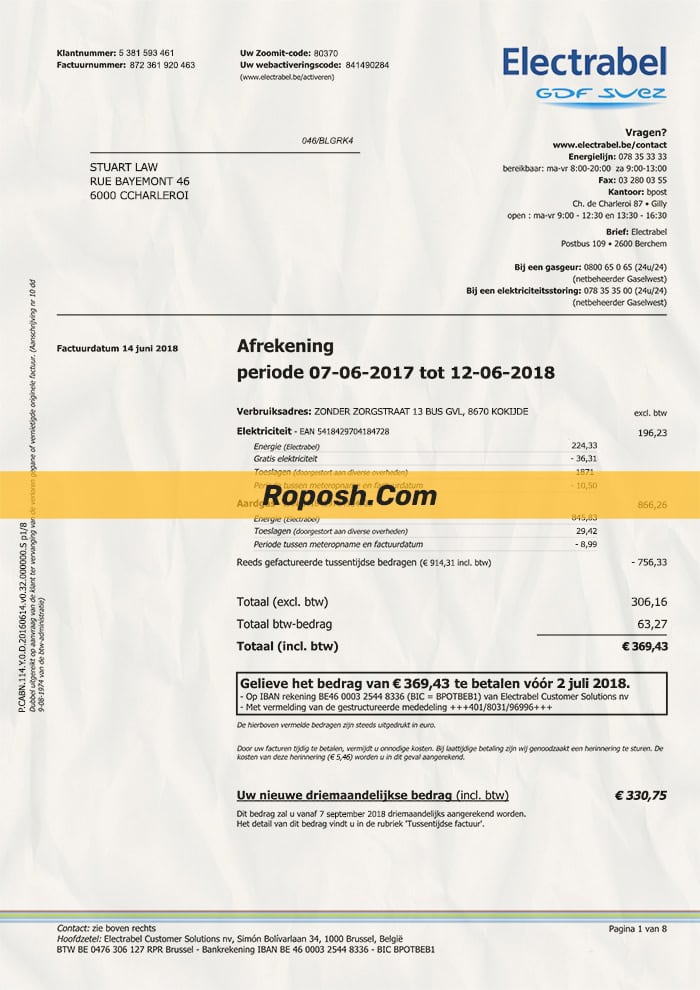 Get your hands on our fully editable Belgium utility bill PSD template from Roposh. Customize it with your own information to create a editable utility bill that looks authentic. Ideal for situations where your ID card is expired, stolen, or unavailable. We also offer a variety of other templates, including passport PSD templates, ID card PSD templates, bank statement PSD templates, driver’s license PSD templates, and utility bill PSD templates.