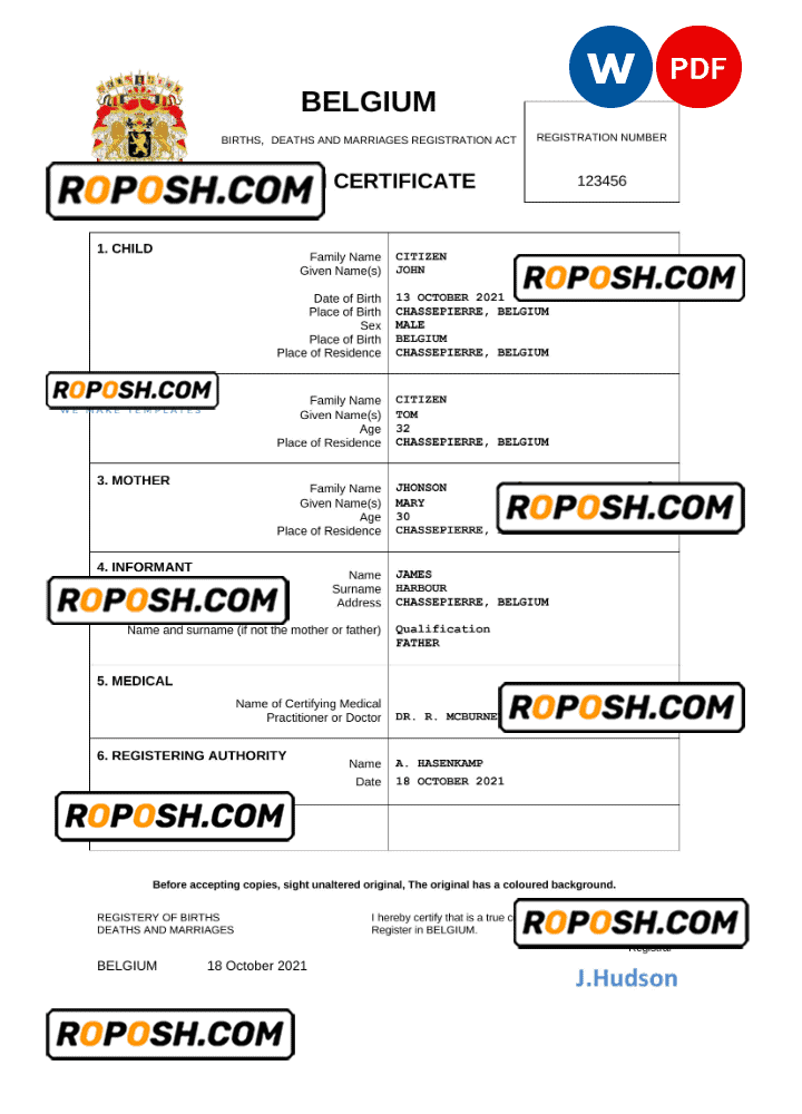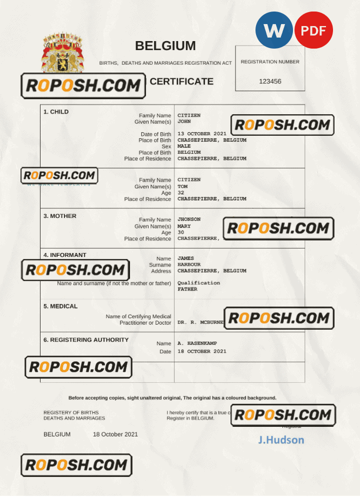 roposh offers hundreds of high-quality, realistic, and customizable birth certificates. The Belgium birth certificate template is fully fillable, and you can complete it with any information you wish, such as name, surname, birth date, place of birth and etc. Whether you are using our PSD template (a layer-based adobe photoshop file) or our PDF template (a Microsoft Office editable file) you will get a package with fonts included instantly. No need to worry even if you can’t generate realistic birth proof yourself, we offer reliable editing service with your desired information for an extra charge. Also, we are always online and here to help you experience a confident purchase. So, reach out!
