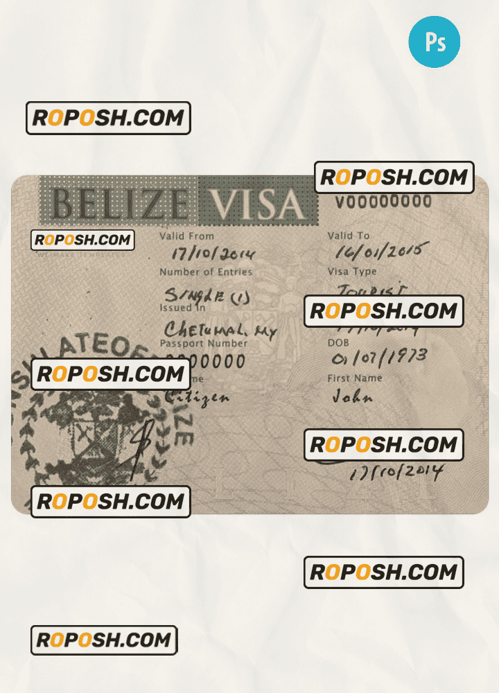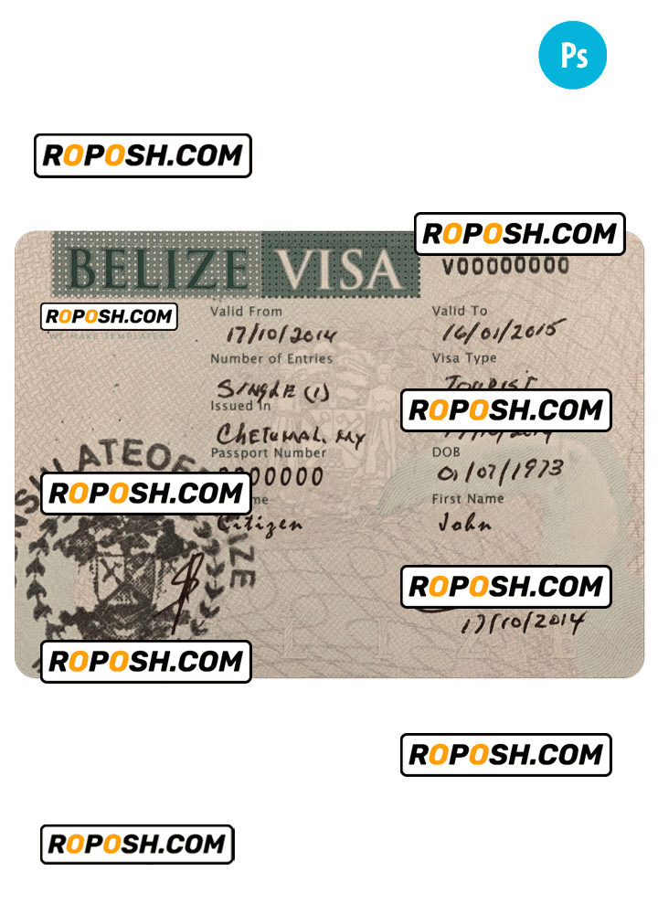 BELIZE travel visa template psd. Buy Customizable Travel Visa Template with high quality and enjoy its unique features such as easy to customize, Layer based, fonts included sample. you can edit this template and put any name, address, license number, Id number, birth date, height, weight, expire date, change photos etc. This Photoshop template is a layer based psd file and it’s easy to Editing.To modify this photoshop template file you will need a Photo editing software such as Adobe Photoshop No need to be expert on editing software like adobe Photoshop. However, You just have to basic knowledge on adobe photoshop, to edit this template. Never used low quality template. Your account may be suspended. Also, if you’re looking for an editable SSN template, Roposh is by your side so you can get it easily and even for free.