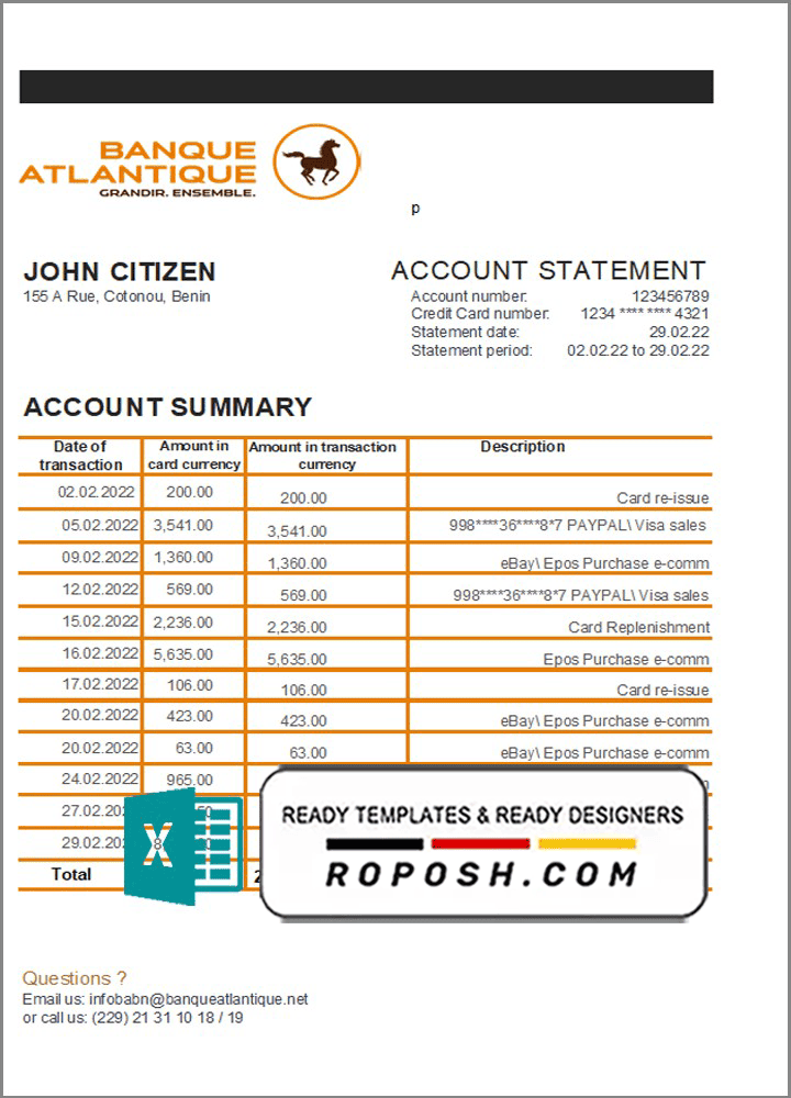 Get your fully editable Benin Banque Atlantique Bank Statement Excel Template from Roposh and customize it with your information to create a realistic bank statement. This is especially useful if your bank statement is expired, stolen, or unavailable. We also offer editable credit card templates, ID card templates, bank statement PSD templates, driver’s license PSD templates, and printable editable blank utility bill templates.
