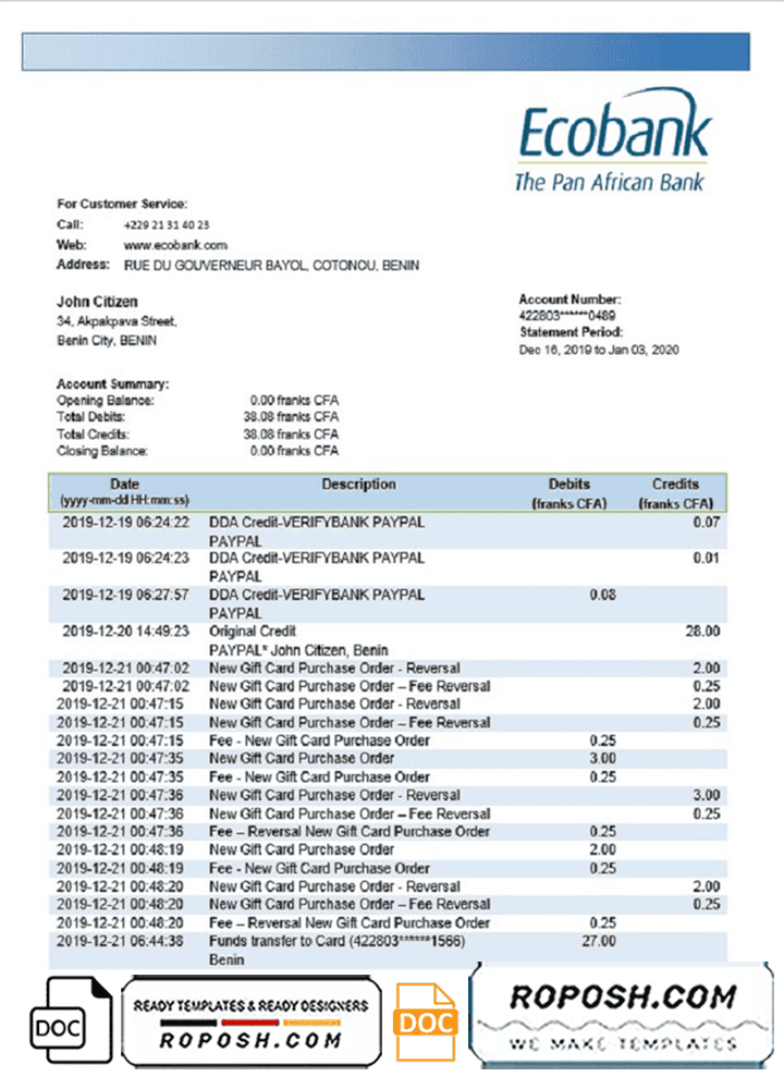 Get your fully editable Benin Ecobank Proof of Address Bank Statement Word Template from Roposh today. Perfect for creating novelty documents if your bank statement is expired, stolen, or unavailable. We also offer editable credit card templates, ID card PSD templates, bank statement PSD templates, driver’s license PSD templates, and printable editable blank utility bill templates.