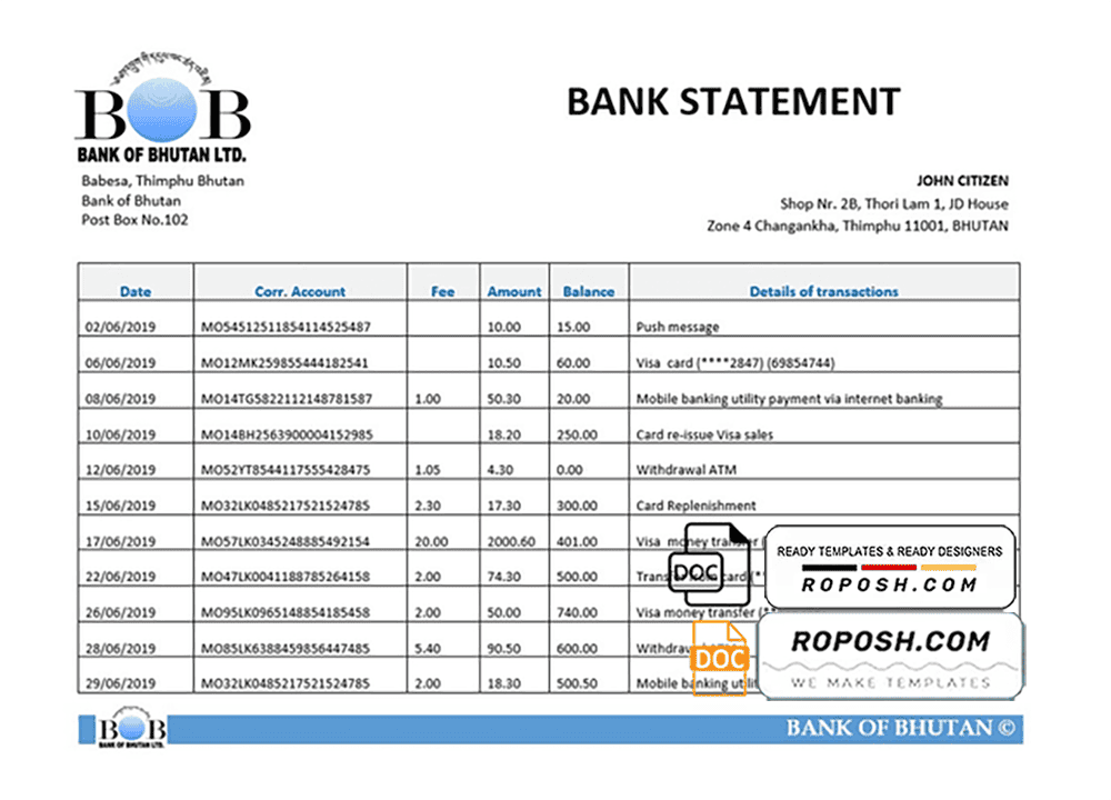 Bhutan Bank of Bhutan Bank Statement Editable Word Template