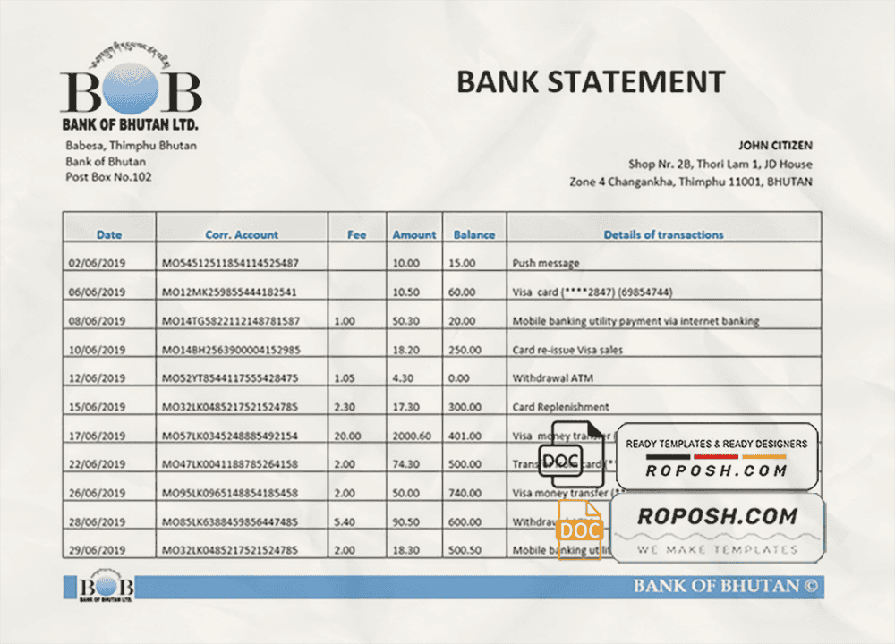 Get your fully editable Bhutan Bank of Bhutan bank statement template from Roposh today. Perfect for creating novelty documents if your original bank statement is expired, stolen, or unavailable. We also offer a variety of other templates including editable credit cards, ID cards, drivers licenses, and utility bills.