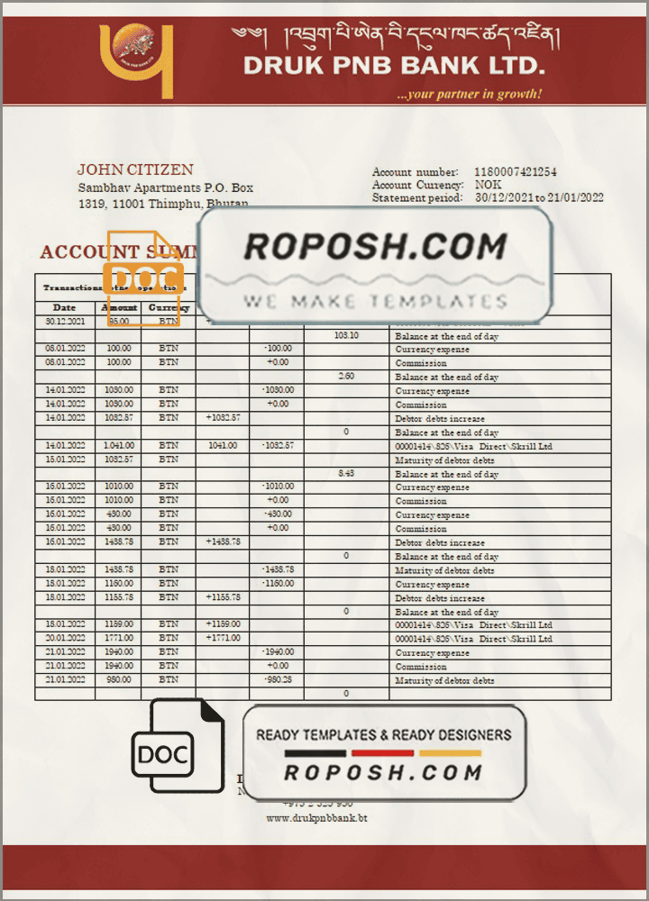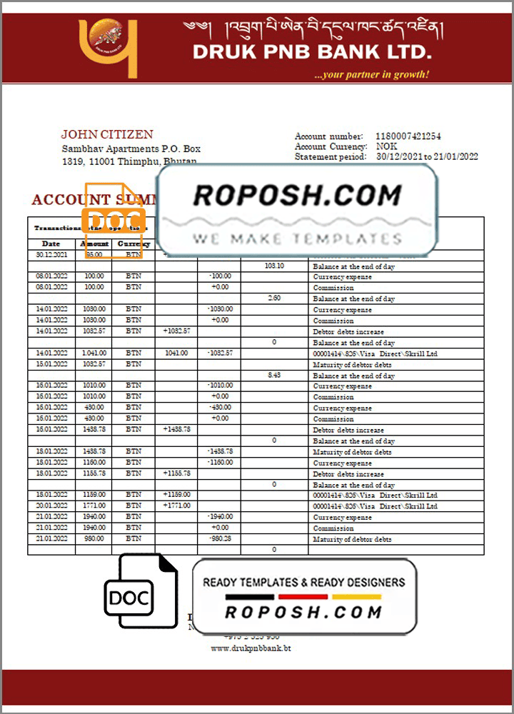 Bhutan Druk PNB bank statement Word and Pdf Template use for :
