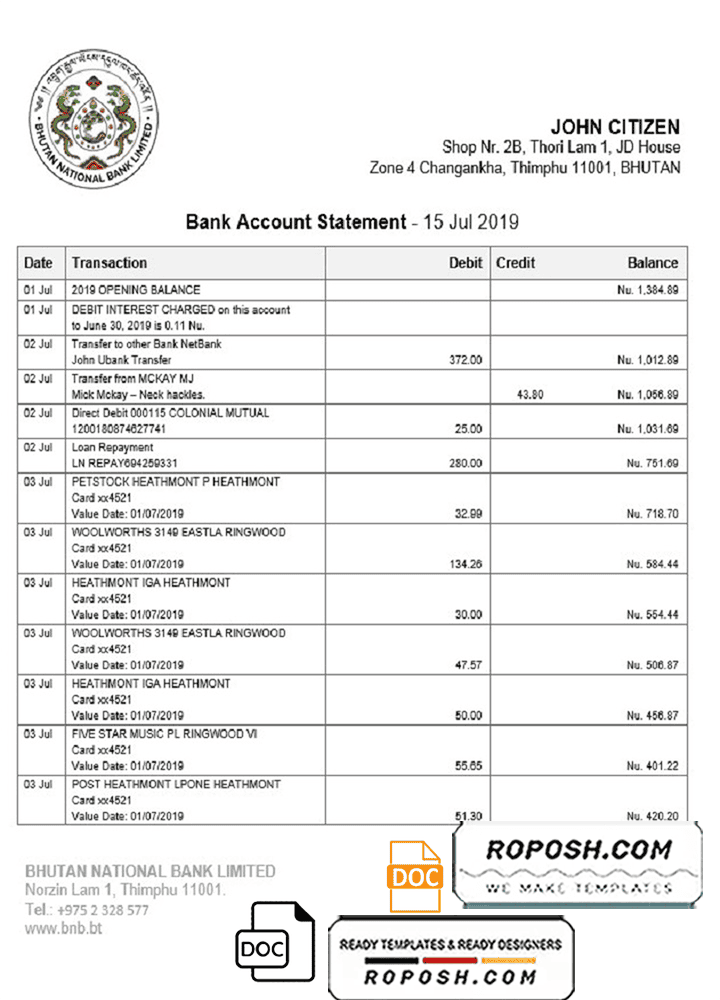 Bhutan National Bank Proof of Address Statement Word Template