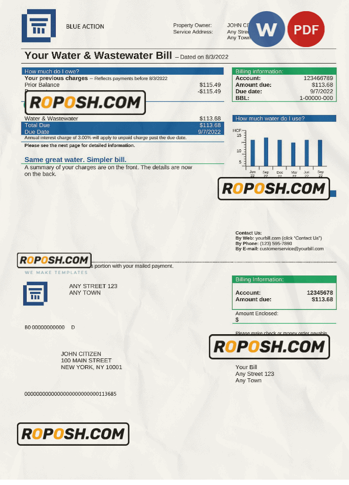 Get your hands on the fully blank Blue Action Universal Multipurpose Utility Bill Template from Roposh. Customize it with your own information to create a editable utility bill for proof of address. Ideal for situations where your utility bill is expired, stolen, or unavailable. We also offer a variety of other templates, including passport PSD templates, ID card PSD templates, bank statement PSD templates, driver’s license PSD templates, and more.