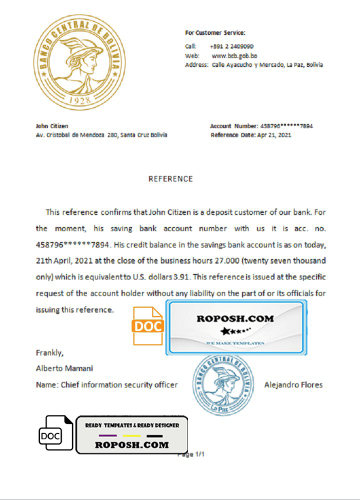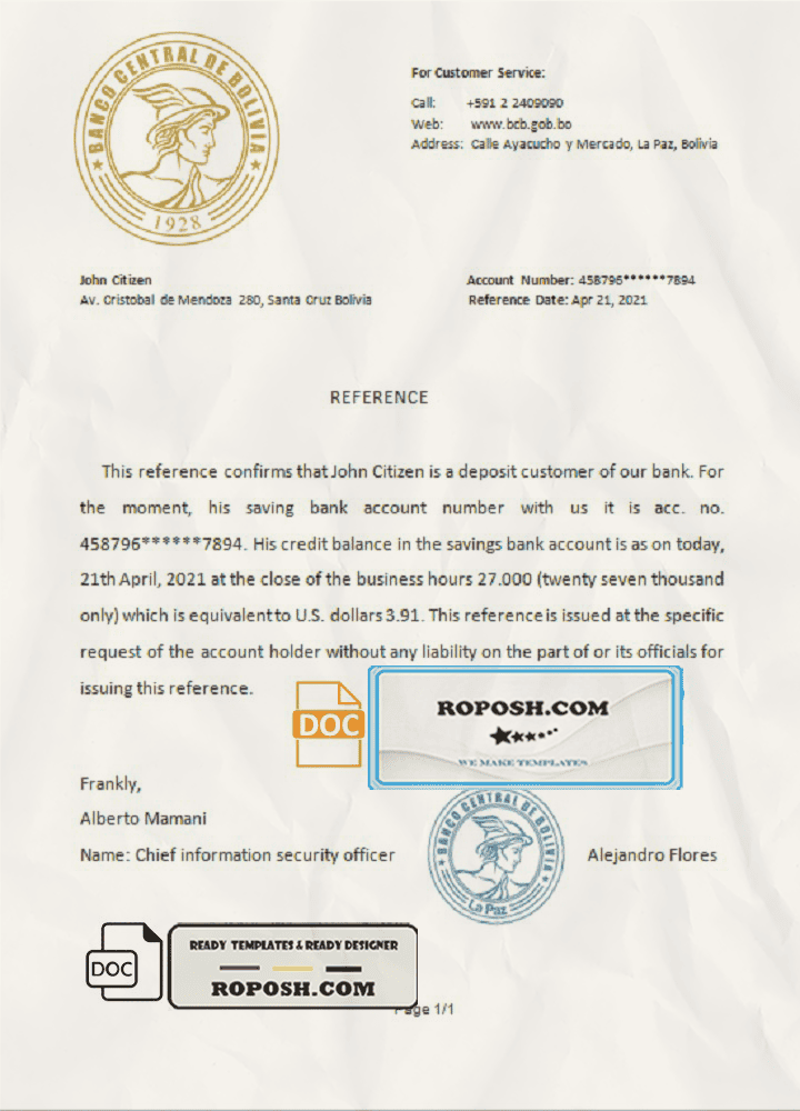 Bolivia Banco Central de Bolivia account reference letter template in Word and PDF format