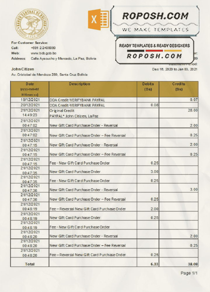 Get your fully editable Bolivia Banco Central de Bolivia Bank Statement Template from Roposh. Customize it with your information to create a realistic bank statement. Ideal for replacing expired, stolen, or unavailable bank statements. We also offer editable credit card templates, ID card templates, bank statement PSD templates, driver’s license PSD templates, and printable editable blank utility bill templates.