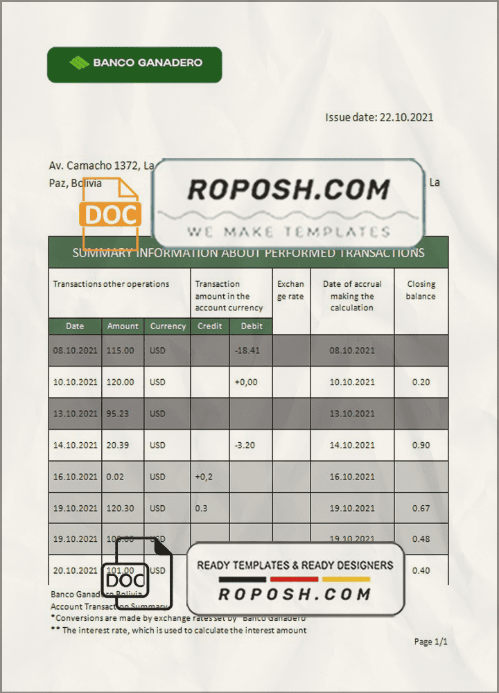 Grab now fully editable Bolivia Banco Ganadero bank statement Word Template from our website Roposh and put your own info to create Realistic Bank Statement Word template and ready your own novelty documents. It’ll be so beneficial if your Bank Statement is expired, stolen or not available.We also have editable credit card, ID Card psd template, Bank Statement psd template, drivers license psd template & printable editable blank utility bill template.