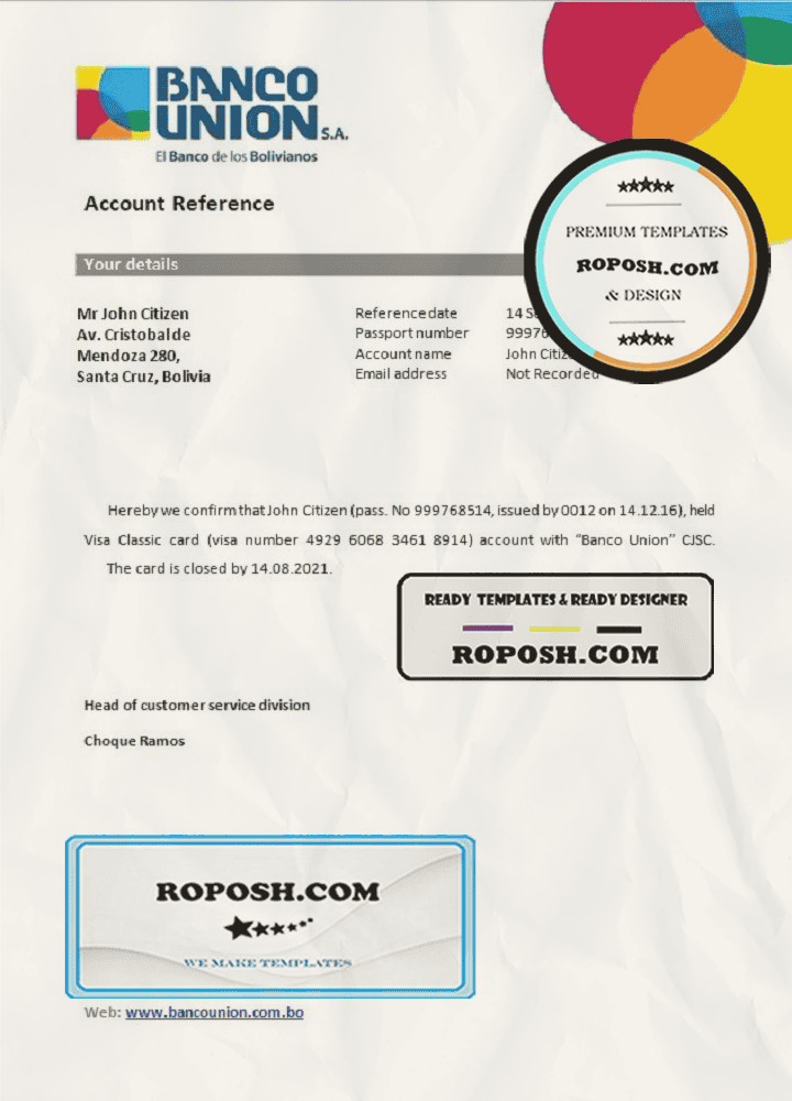 Bolivia Banco Union bank account closure reference letter template in Word and PDF format