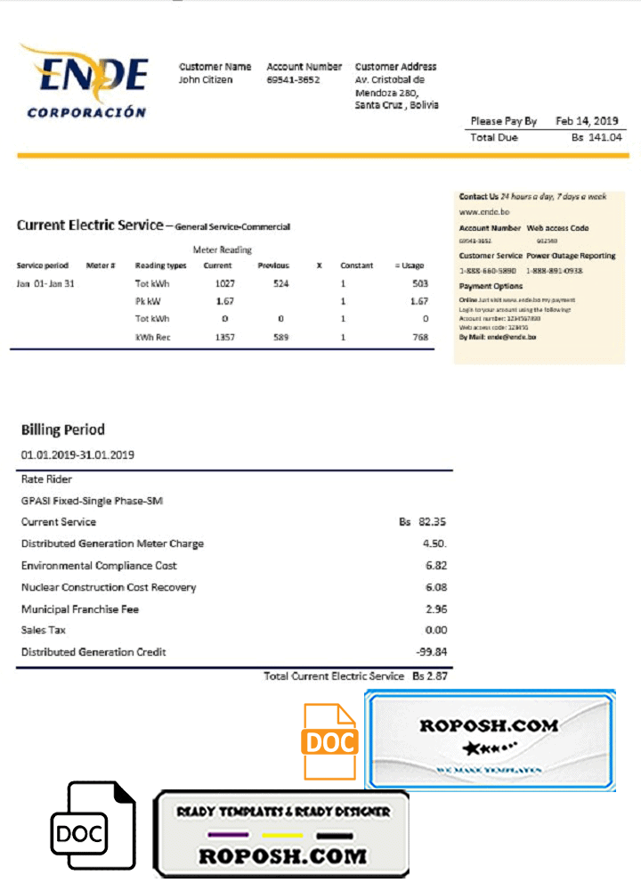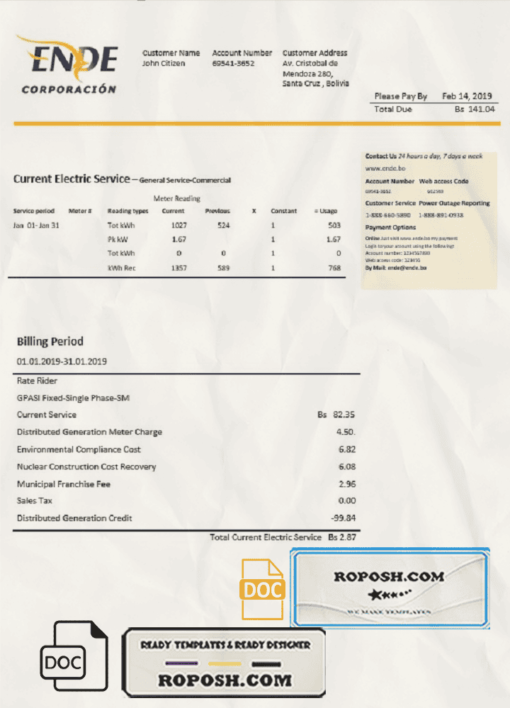 Download our fully editable Bolivia ENDE Corporacion electricity utility bill Word template. This high-quality, customizable template is layer-based and includes all necessary fonts. Easily modify the template to include any name, address, license number, ID number, birth date, height, weight, expiration date, and more. Perfect for creating a editable utility bill for proof of address. Ensure your documents are up-to-date and avoid account suspensions. Requires Microsoft Word for editing.