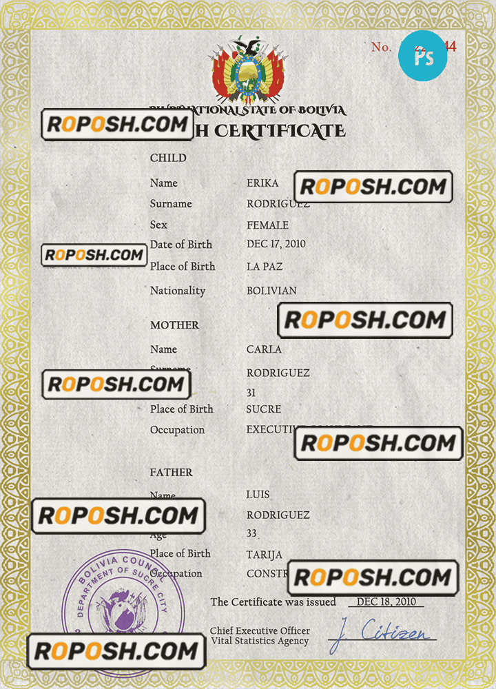 roposh offers hundreds of high-quality, realistic, and customizable birth certificates. The Bolivia birth certificate template is fully fillable, and you can complete it with any information you wish, such as name, surname, birth date, place of birth and etc. Whether you are using our PSD template (a layer-based adobe photoshop file) or our PDF template (a Microsoft Office editable file) you will get a package with fonts included instantly. No need to worry even if you can’t generate realistic birth proof yourself, we offer reliable editing service with your desired information for an extra charge. Also, we are always online and here to help you experience a confident purchase. So, reach out!