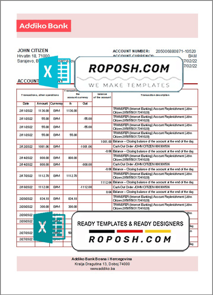 Get your fully editable Bosnia and Herzegovina Addiko Bank Statement Excel Template from Roposh and personalize it to create your own novelty documents. This template is beneficial if your bank statement is expired, stolen, or unavailable. We also offer editable credit card templates, ID card PSD templates, bank statement PSD templates, driver’s license PSD templates, and printable editable blank utility bill templates.