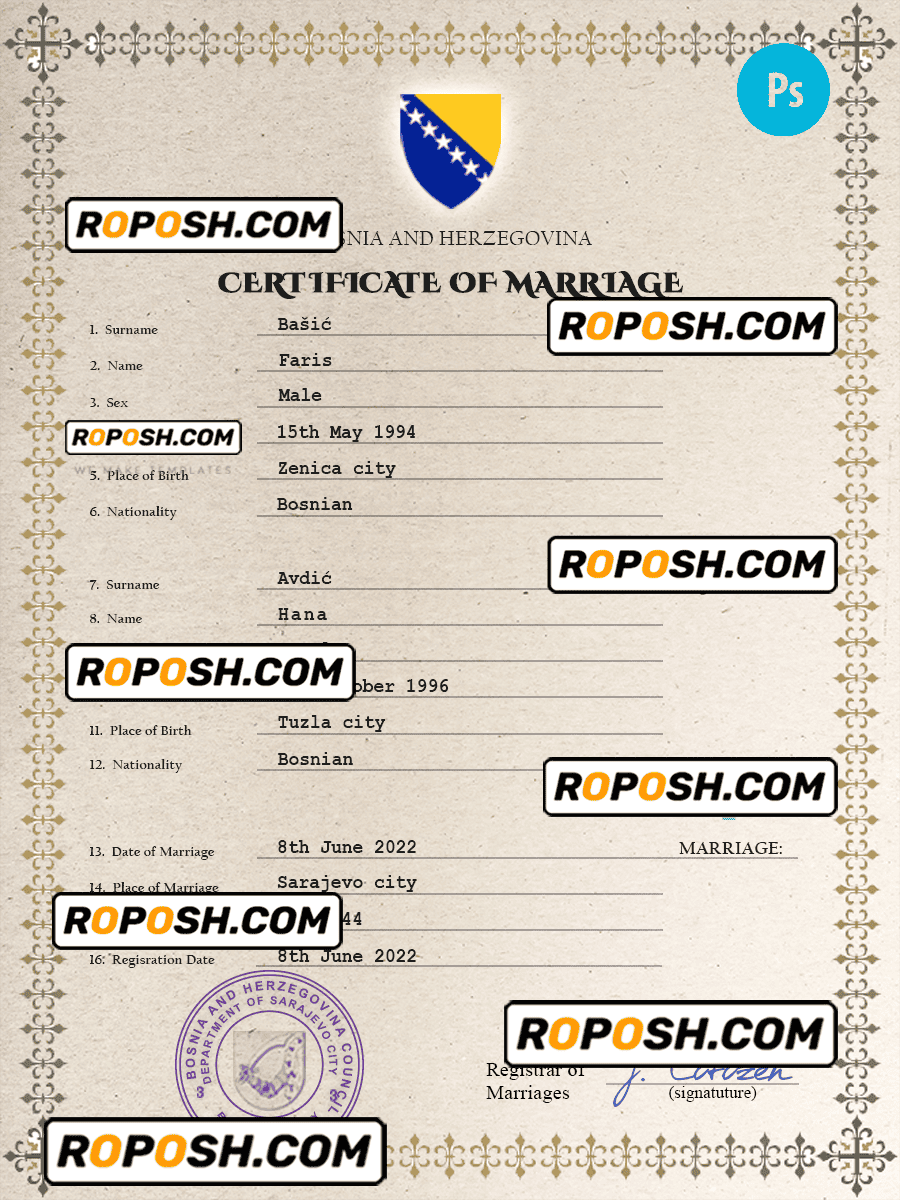 Bosnia and Herzegovina marriage certificate PSD template, completely editable