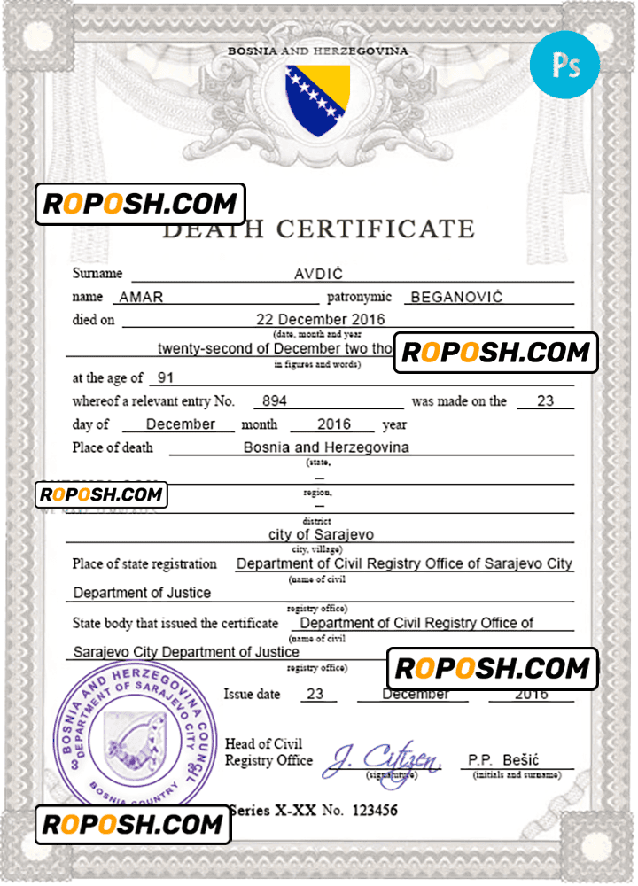 Explore a vast collection of legitimate-looking editable death certificates for several countries worldwide. The editable Bosnia and Herzegovina death certificates offers easy access to obtaining the required document for a variety of purposes, predominantly claiming life insurance, pensions, and resolving estates.