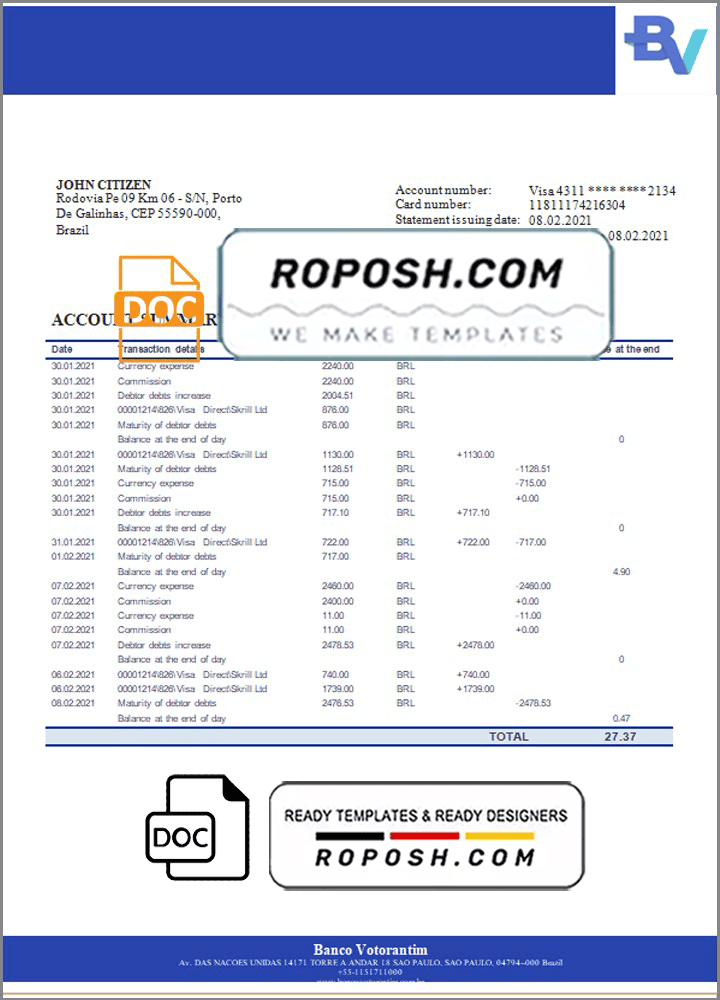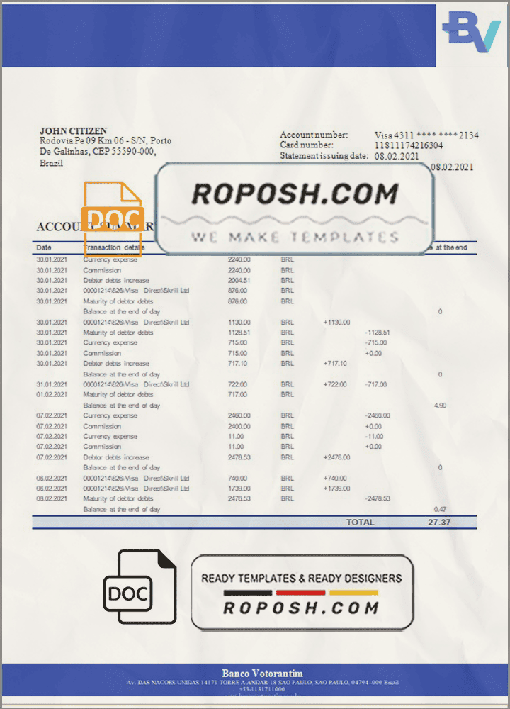blank Brazil Banco Votorantim bank statement Word template . Fully editable Word template. High quality template. Easy to customize, Layer based, fonts included. you can edit this template and put any name, address, license number, Id number, birth date, height, weight, expire date, change photos etc. This Word template is a easy to Editing.To modify this Word template file you will need a Word editing software such as Microsoft Word.Our downloadable bank statement templates enable you to submit the required information. So, you can easily fill out your banking statement assets.You do Not need Photoshop for editing this template. Never used low quality template. Your account may be suspended.