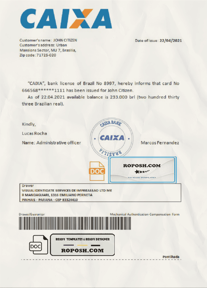 Brazil Caixa bank account reference letter template in Word and PDF format