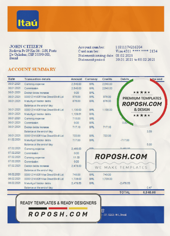 Grab now fully editable Brazil Itau bank statement Excel Template from our website Roposh and put your own info to create Realistic Bank Statement template Excel and ready your own novelty documents. It’ll be so beneficial if your Bank Statement is expired, stolen or not available.We also have editable credit card, ID Card psd template, Bank Statement psd template, drivers license psd template & printable editable blank utility bill template.