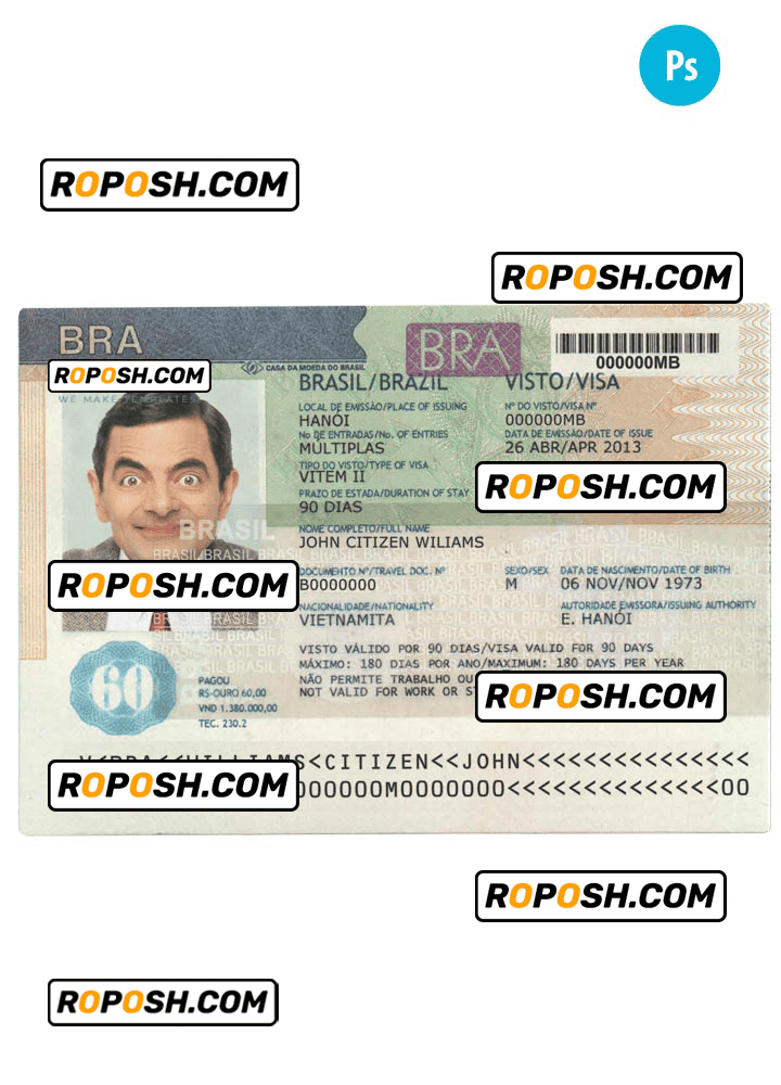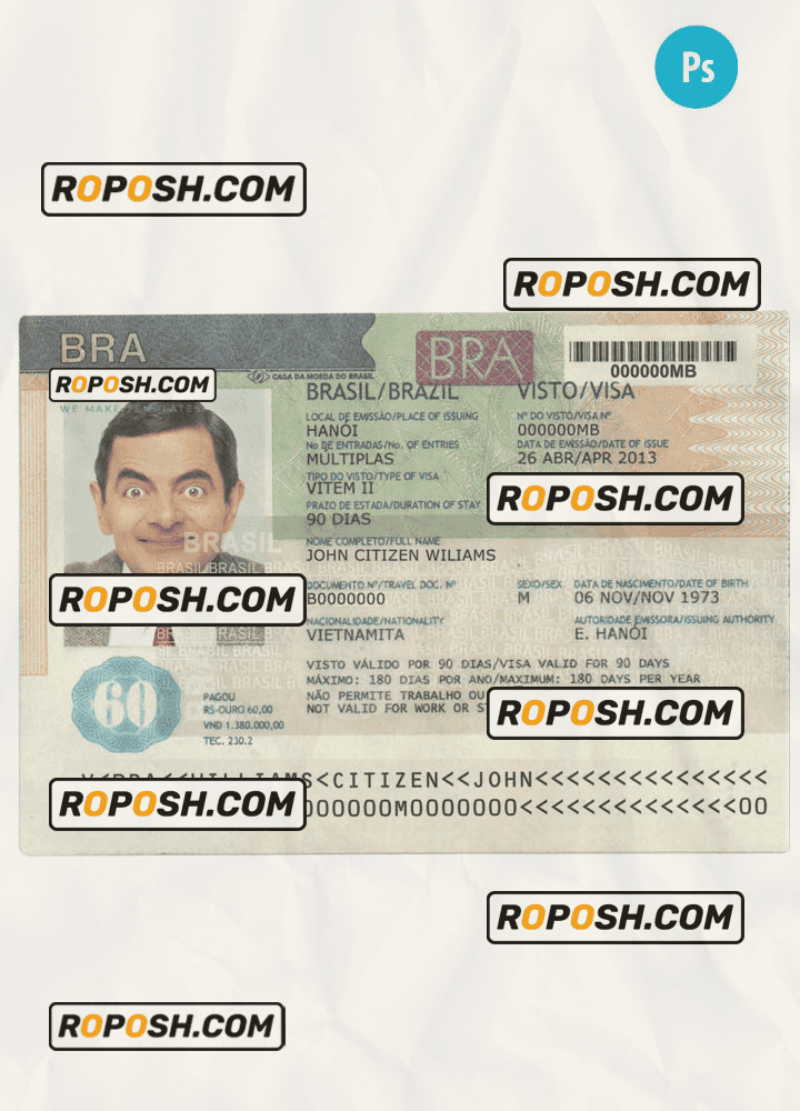 BRAZIL visa template psd. Buy Customizable Travel Visa Template with high quality and enjoy its unique features such as easy to customize, Layer based, fonts included sample. you can edit this template and  put any name, address, license number, Id number, birth date, height, weight, expire date, change photos etc. This Photoshop template is a layer based psd file and it’s easy to Editing.To modify this photoshop template file you will need a Photo editing software such as Adobe Photoshop No need to be expert on editing software like adobe Photoshop. However, You just have to basic knowledge on adobe photoshop, to edit this template. Never used low quality template. Your account may be suspended. Also, if you’re looking for an editable SSN template, Roposh is by your side so you can get it easily and even for free.