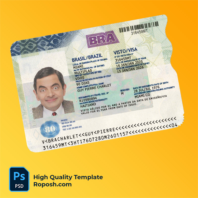 Brazil Visa template psd. Buy Customizable Travel Visa Template with high quality and enjoy its unique features such as easy to customize, Layer based, fonts included sample. you can edit this template and  put any name, address, license number, Id number, birth date, height, weight, expire date, change photos etc. This Photoshop template is a layer based psd file and it’s easy to Editing.To modify this photoshop template file you will need a Photo editing software such as Adobe Photoshop No need to be expert on editing software like adobe Photoshop. However, You just have to basic knowledge on adobe photoshop, to edit this template. Never used low quality template. Your account may be suspended. Also, if you’re looking for an editable SSN template, Roposh is by your side so you can get it easily and even for free.