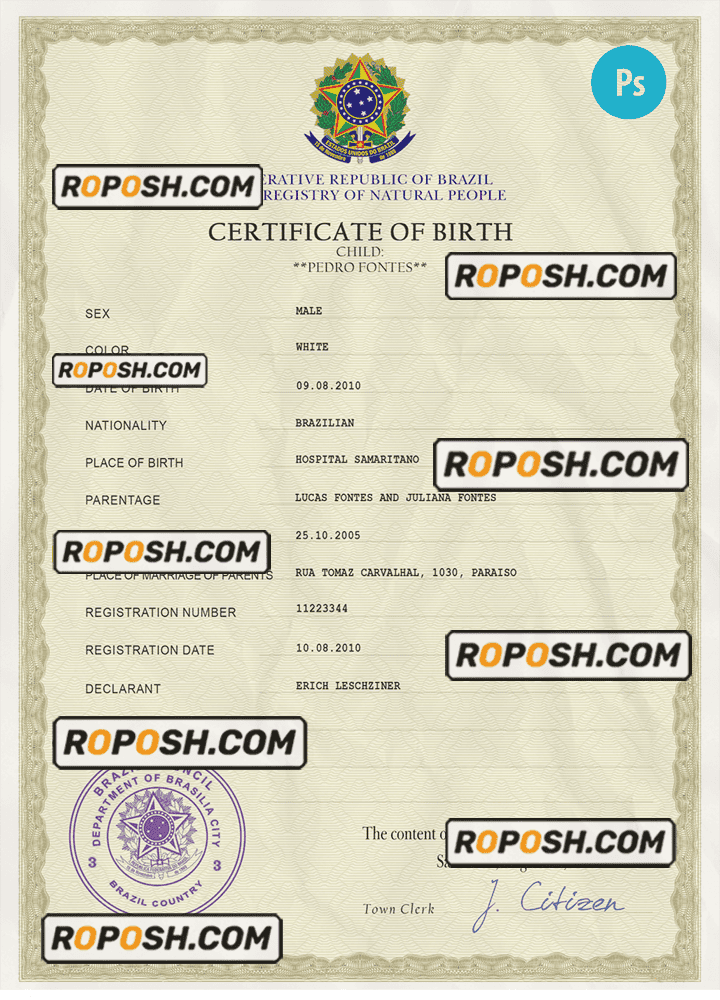roposh offers hundreds of high-quality, realistic, and customizable birth certificates. The Brazil birth certificate template is fully fillable, and you can complete it with any information you wish, such as name, surname, birth date, place of birth and etc. Whether you are using our PSD template (a layer-based adobe photoshop file) or our PDF template (a Microsoft Office editable file) you will get a package with fonts included instantly. No need to worry even if you can’t generate realistic birth proof yourself, we offer reliable editing service with your desired information for an extra charge. Also, we are always online and here to help you experience a confident purchase. So, reach out!