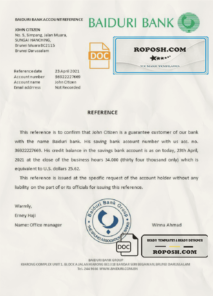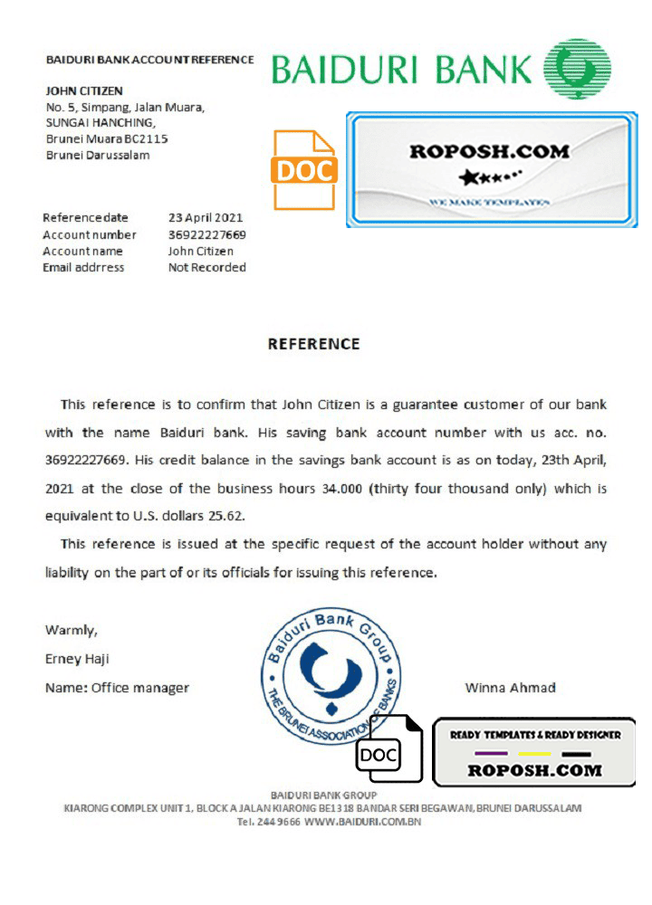Brunei Baiduri bank account reference letter template in Word and PDF format