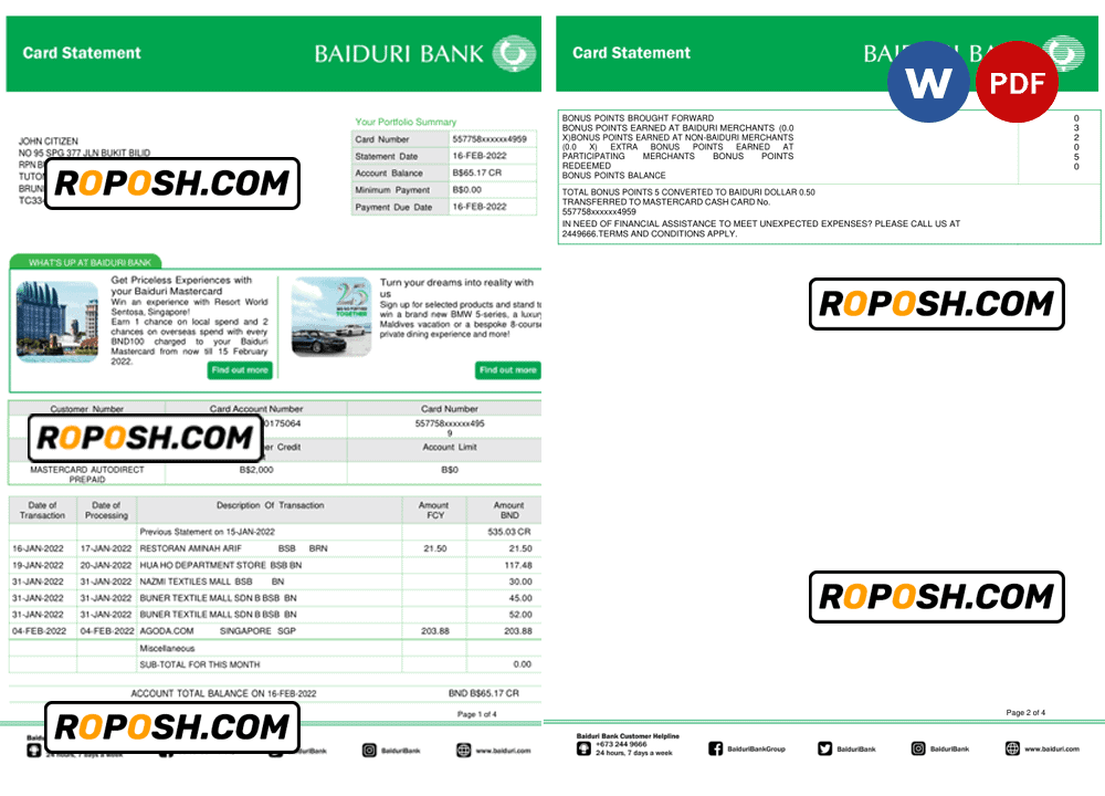 Get your fully editable Brunei Baiduri Bank Card Statement Template from Roposh today. Customize it with your information to create realistic bank statements for your projects. We also offer a variety of other templates, including editable credit card, ID card, bank statement PSD templates, driver’s license PSD templates, and printable editable blank utility bill templates.