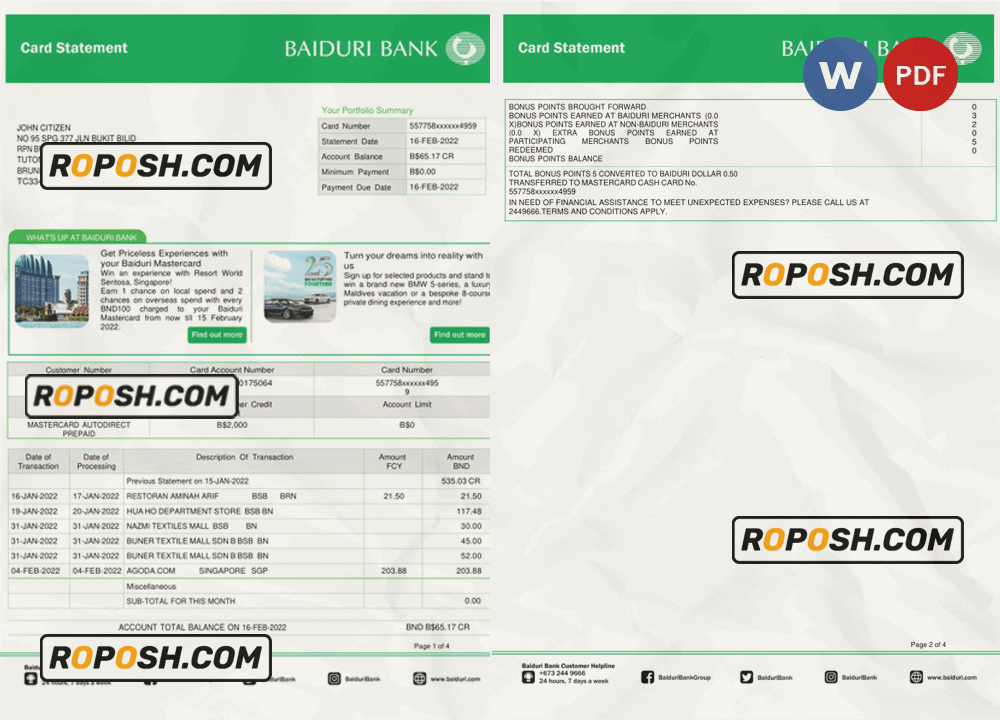Be the first to review “Brunei Baiduri bank card statement, Word and PDF template, 4 pages”