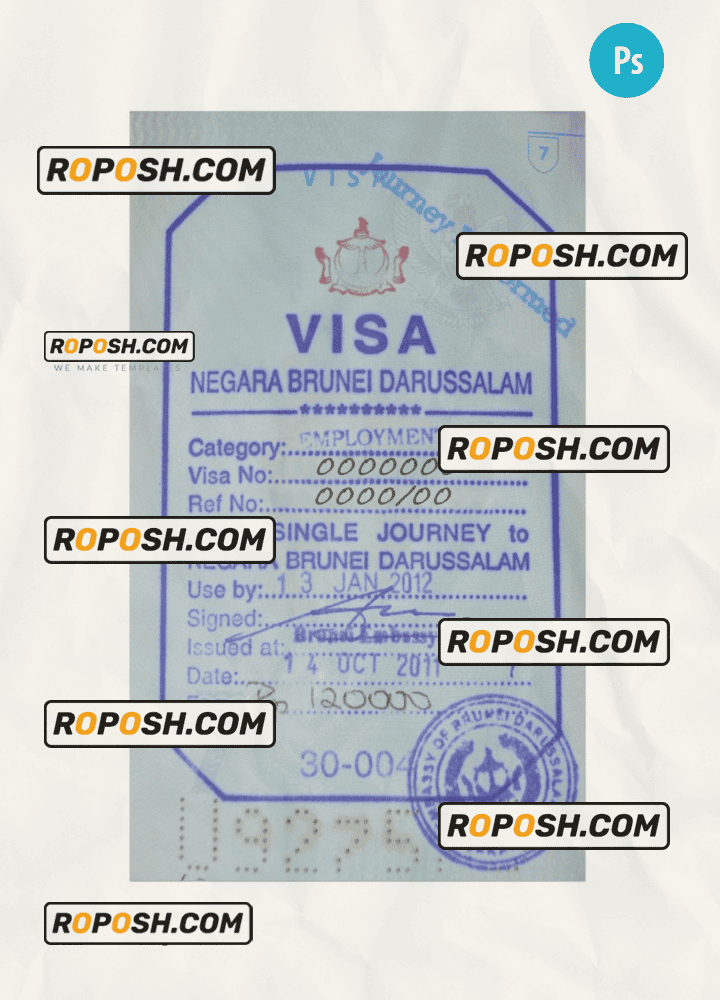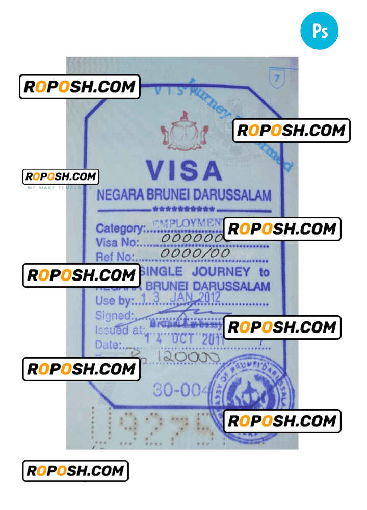 BRUNEI stamp tourist visa template psd. Buy Customizable Travel Visa Template with high quality and enjoy its unique features such as easy to customize, Layer based, fonts included sample. you can edit this template and  put any name, address, license number, Id number, birth date, height, weight, expire date, change photos etc. This Photoshop template is a layer based psd file and it’s easy to Editing.To modify this photoshop template file you will need a Photo editing software such as Adobe Photoshop No need to be expert on editing software like adobe Photoshop. However, You just have to basic knowledge on adobe photoshop, to edit this template. Never used low quality template. Your account may be suspended. Also, if you’re looking for an editable SSN template, Roposh is by your side so you can get it easily and even for free.
