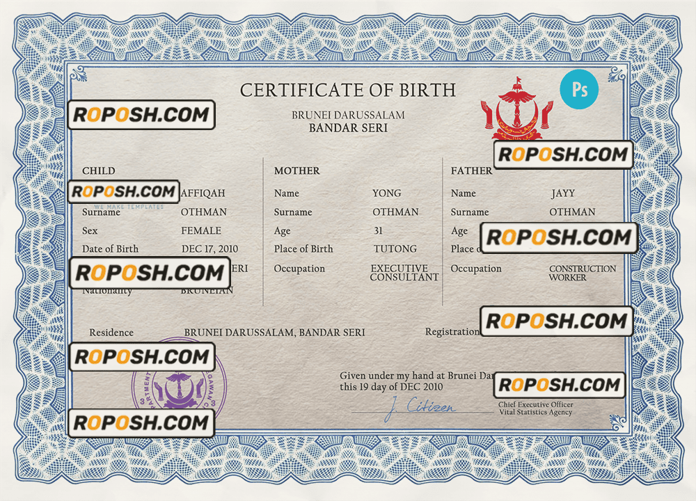 roposh offers hundreds of high-quality, realistic, and customizable birth certificates. The Brunei birth certificate template is fully fillable, and you can complete it with any information you wish, such as name, surname, birth date, place of birth and etc. Whether you are using our PSD template (a layer-based adobe photoshop file) or our PDF template (a Microsoft Office editable file) you will get a package with fonts included instantly. No need to worry even if you can’t generate realistic birth proof yourself, we offer reliable editing service with your desired information for an extra charge. Also, we are always online and here to help you experience a confident purchase. So, reach out!