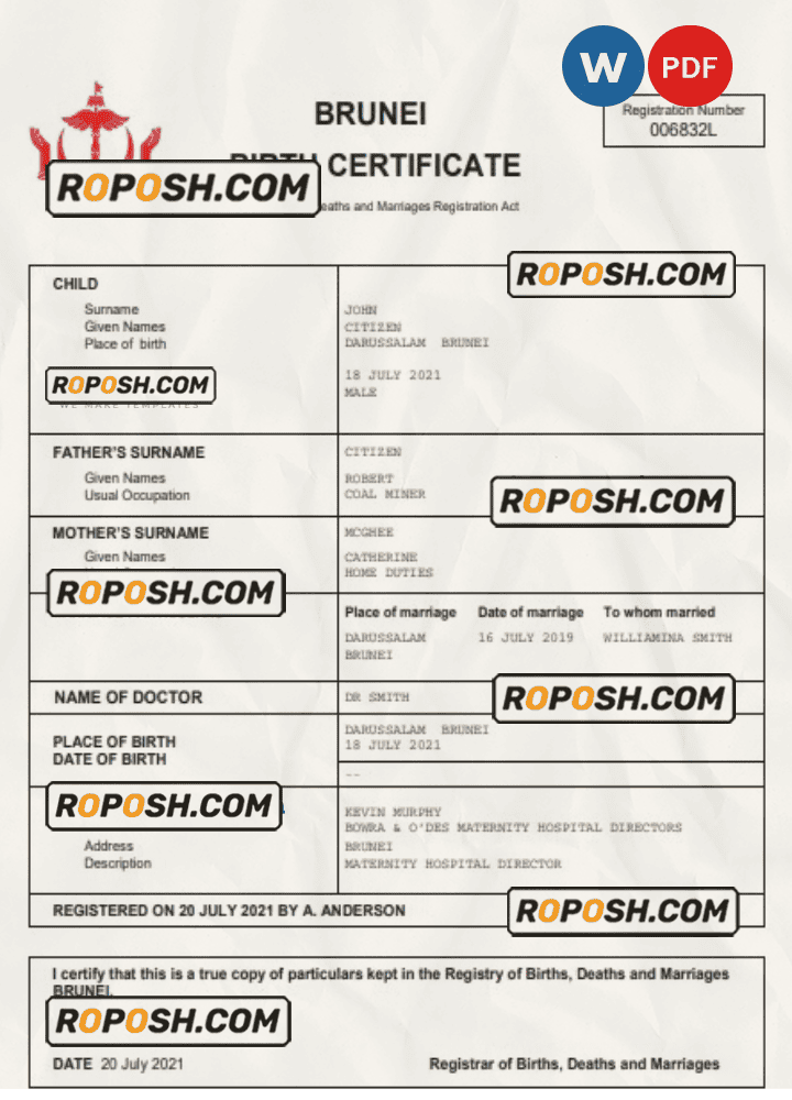 roposh offers hundreds of high-quality, realistic, and customizable birth certificates. The Brunei birth certificate template is fully fillable, and you can complete it with any information you wish, such as name, surname, birth date, place of birth and etc. Whether you are using our PSD template (a layer-based adobe photoshop file) or our PDF template (a Microsoft Office editable file) you will get a package with fonts included instantly. No need to worry even if you can’t generate realistic birth proof yourself, we offer reliable editing service with your desired information for an extra charge. Also, we are always online and here to help you experience a confident purchase. So, reach out!