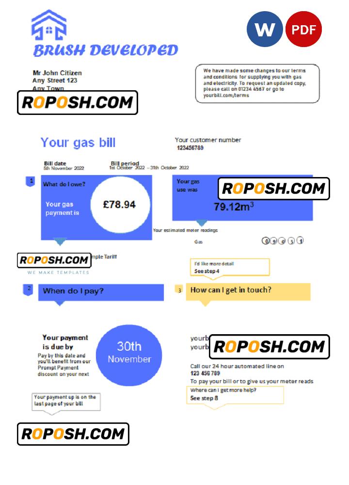 Introducing our Brush Developed Universal Multipurpose Utility Bill Template, available in both Word and PDF formats. Perfect for those who have lost their original documents, this high-quality, customizable template is ideal for identity verification on trade sites, digital currency platforms, payment services, and more. Ensure seamless transactions and verifications with our realistic, easy-to-edit utility bill template.