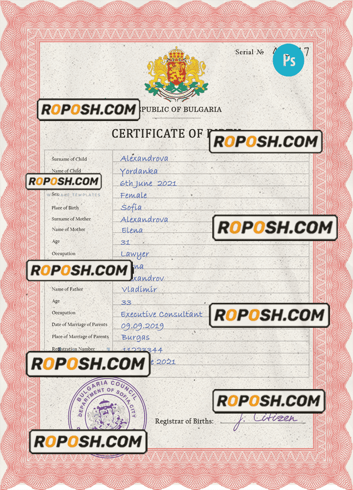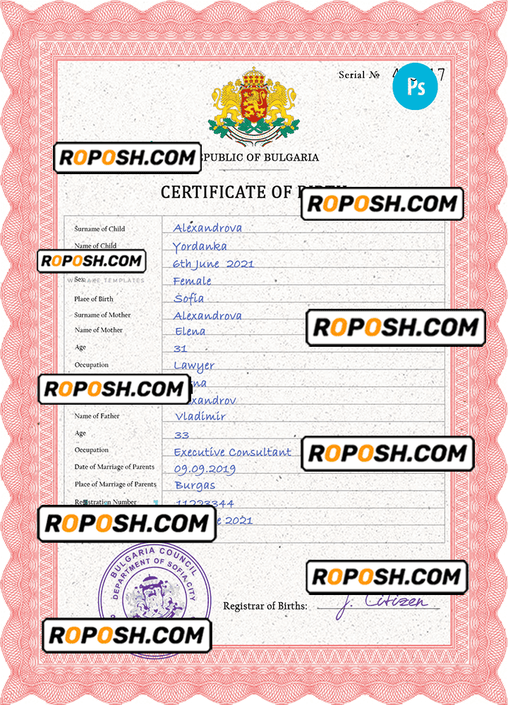 roposh offers hundreds of high-quality, realistic, and customizable birth certificates. The Bulgaria birth certificate template is fully fillable, and you can complete it with any information you wish, such as name, surname, birth date, place of birth and etc. Whether you are using our PSD template (a layer-based adobe photoshop file) or our PDF template (a Microsoft Office editable file) you will get a package with fonts included instantly. No need to worry even if you can’t generate realistic birth proof yourself, we offer reliable editing service with your desired information for an extra charge. Also, we are always online and here to help you experience a confident purchase. So, reach out!