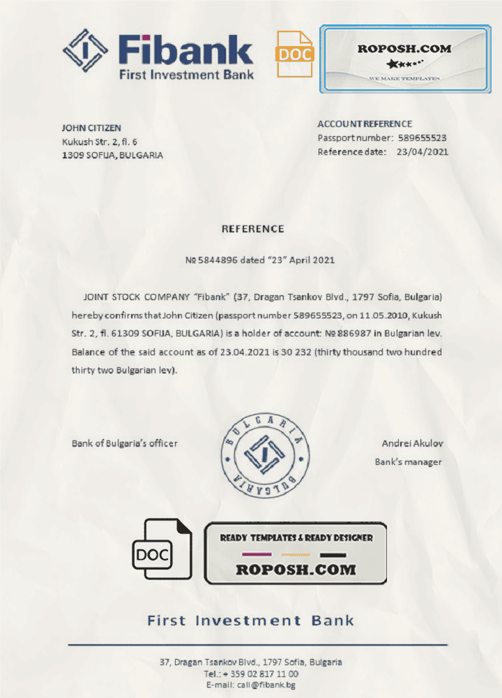 Bulgaria First Investment bank reference letter template in Word and PDF format