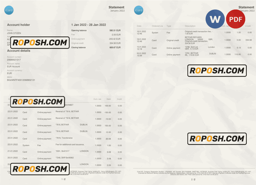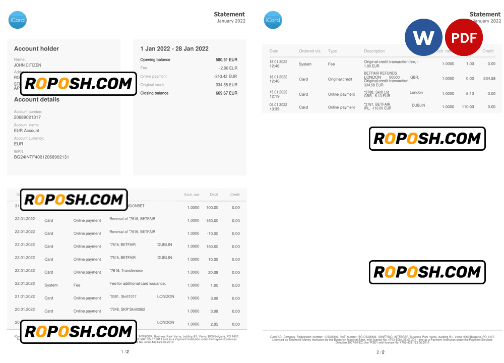 Get your fully editable Bulgaria iCard statement template from Roposh today. Perfect for creating novelty documents if your bank statement is expired, stolen, or unavailable. We also offer editable credit card templates, ID card templates, bank statement PSD templates, driver’s license PSD templates, and printable editable blank utility bill templates.