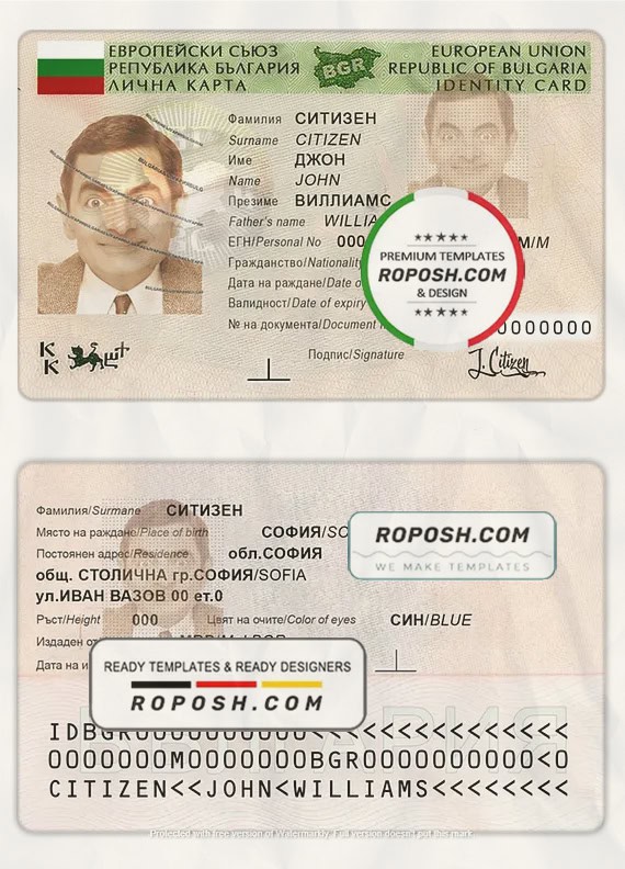 Download our high-quality, fully editable Bulgaria ID Card PSD Template. This Photoshop template is designed for easy customization, allowing you to modify details such as name, address, ID number, birth date, height, weight, expiration date, and photos. This template is layer-based and includes all necessary fonts, making it simple to edit with basic Photoshop skills.