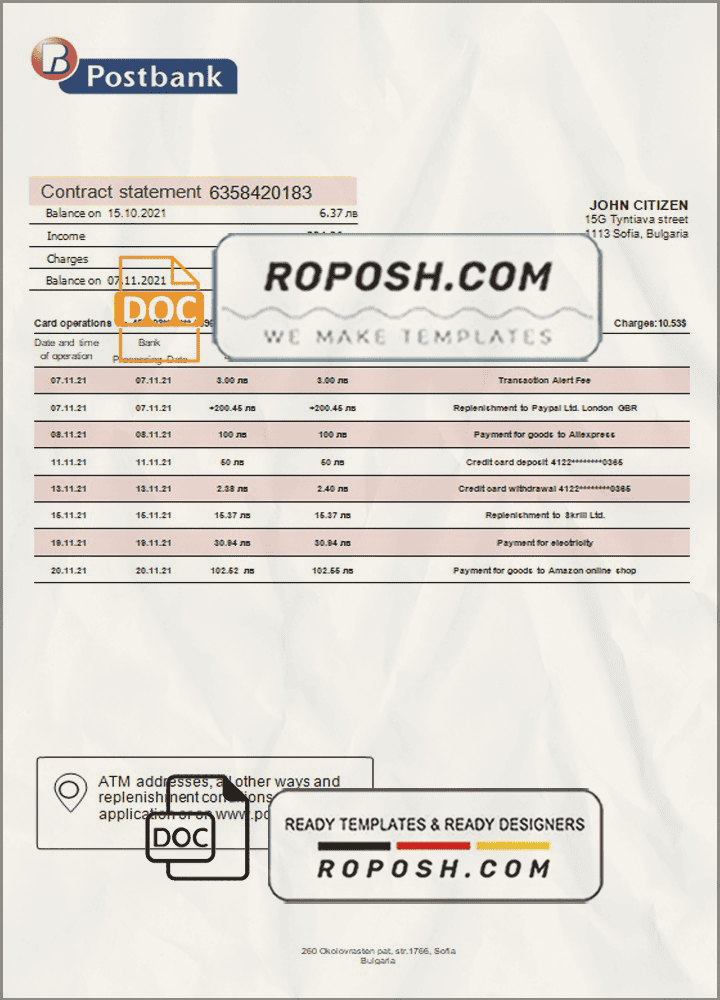 Bulgaria Postbank bank proof of addres statement Word and Pdf Template use for :