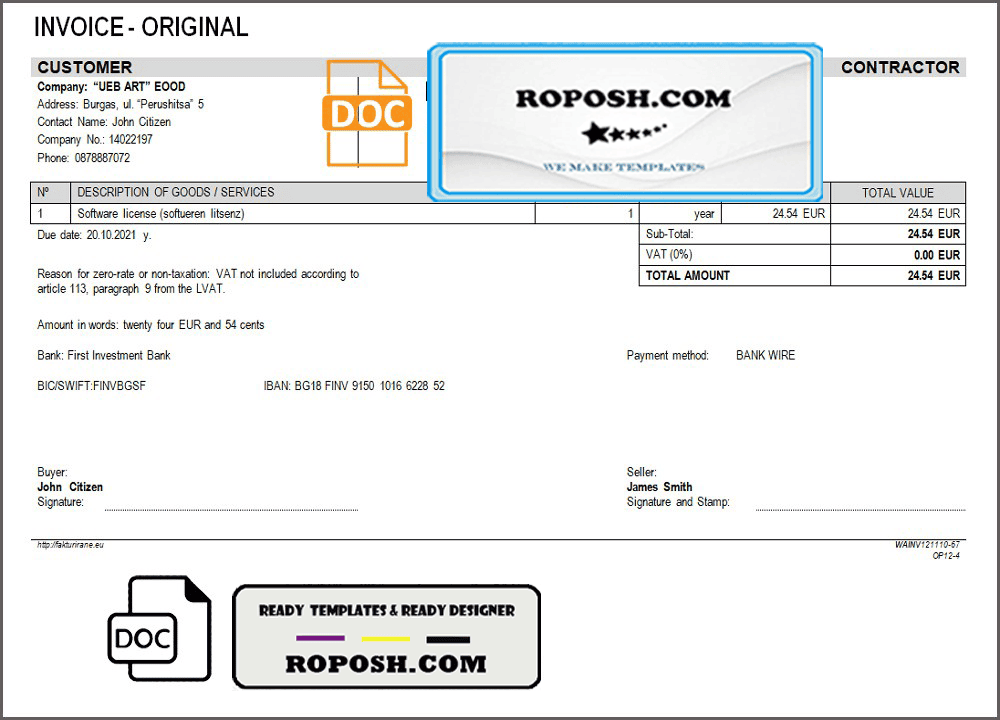 Featuring a wide range of templates from all over the world, the Bulgary UEB ART EOOD Company invoice Word Template is fully customizable, and included fonts. Edit all relevant details, such as name, photo, signature, barcodes, and holograms, to create a realistic, high-quality editable invoice template.